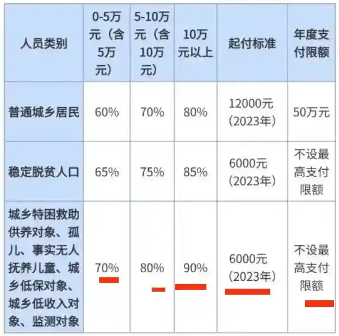 如图二,广西的低保身份,在大病住院治疗过程中,大病统筹报销比例提高,起付线由1.2万降到0.6万,且不设封顶线。