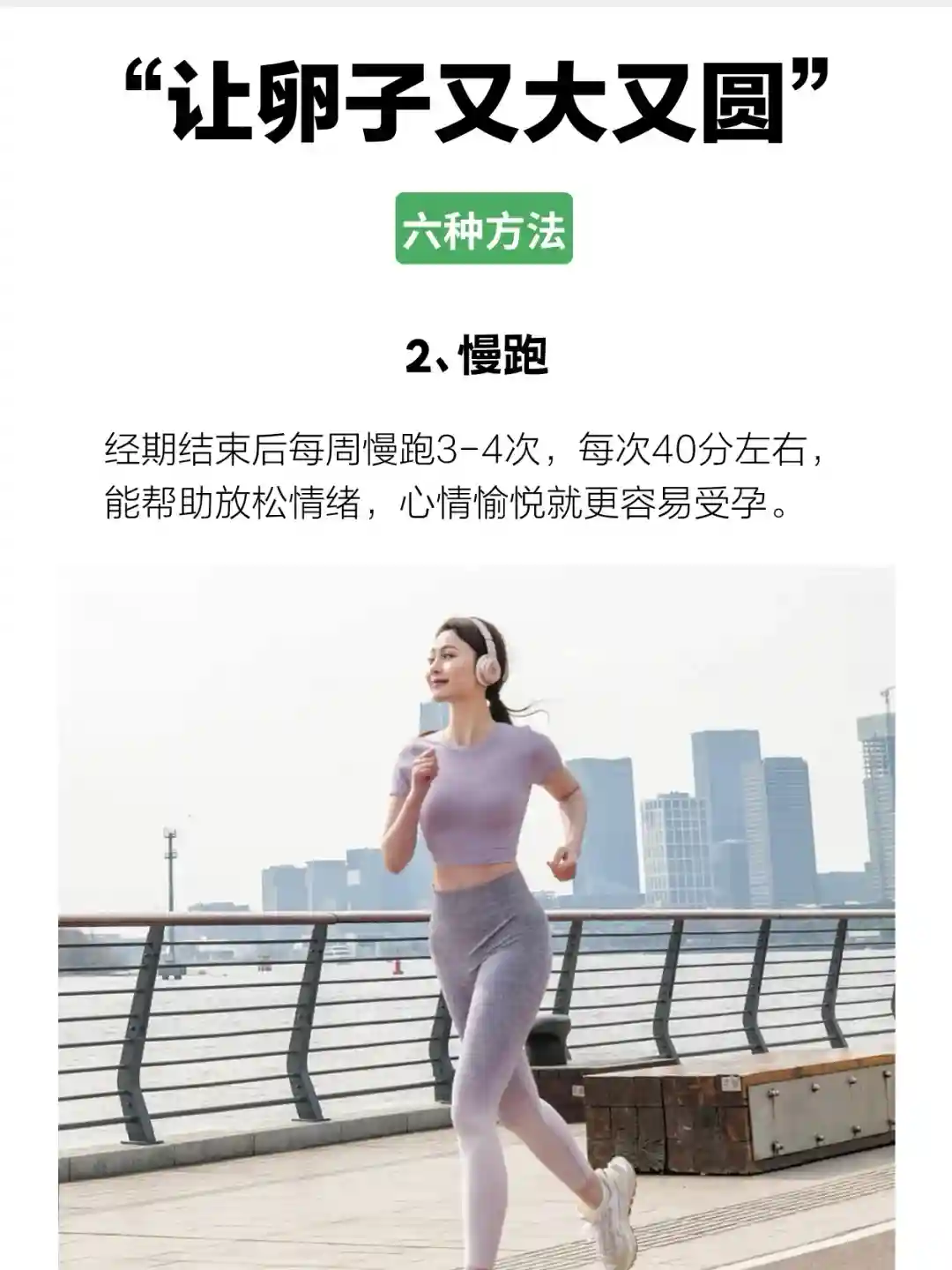 经期结束后每周慢跑3-4次,每次40分钟左右,能帮助放松情绪,心情愉悦就更容易受孕。