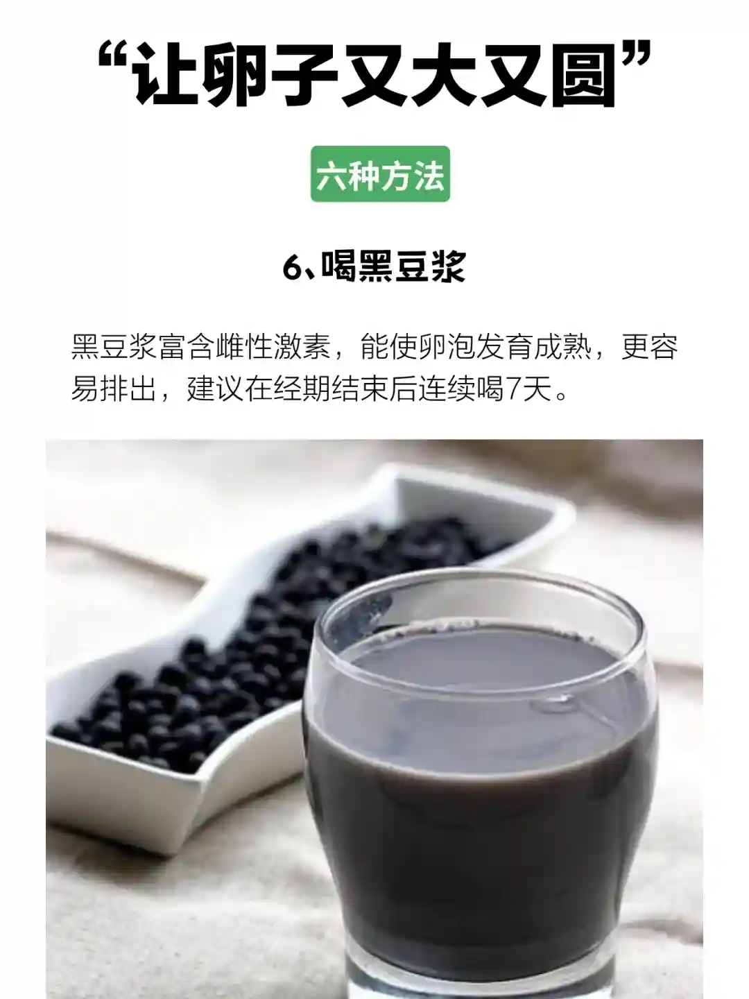 黑豆浆富含雌性激素,能使卵泡发育成熟,更容易排出,建议在经期结束后连续喝7天。