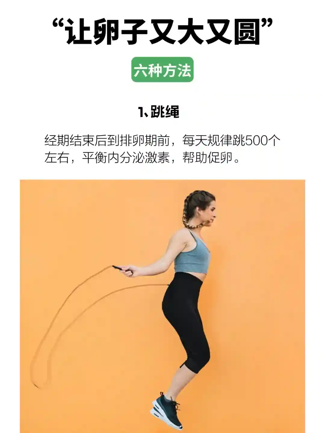 经期结束后到排卵期前,每天规律跳绳500个左右,平衡内分泌激素,帮助促卵。