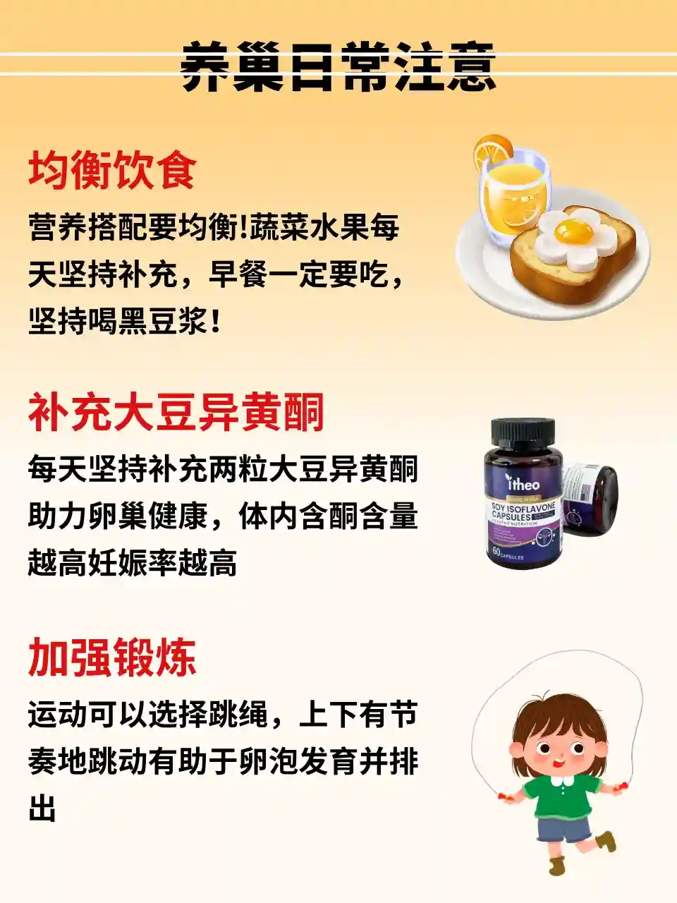 每天坚持补充两粒大豆异黄酮助力卵巢的健康,研究表明体内含酮量越高妊娠率越高。