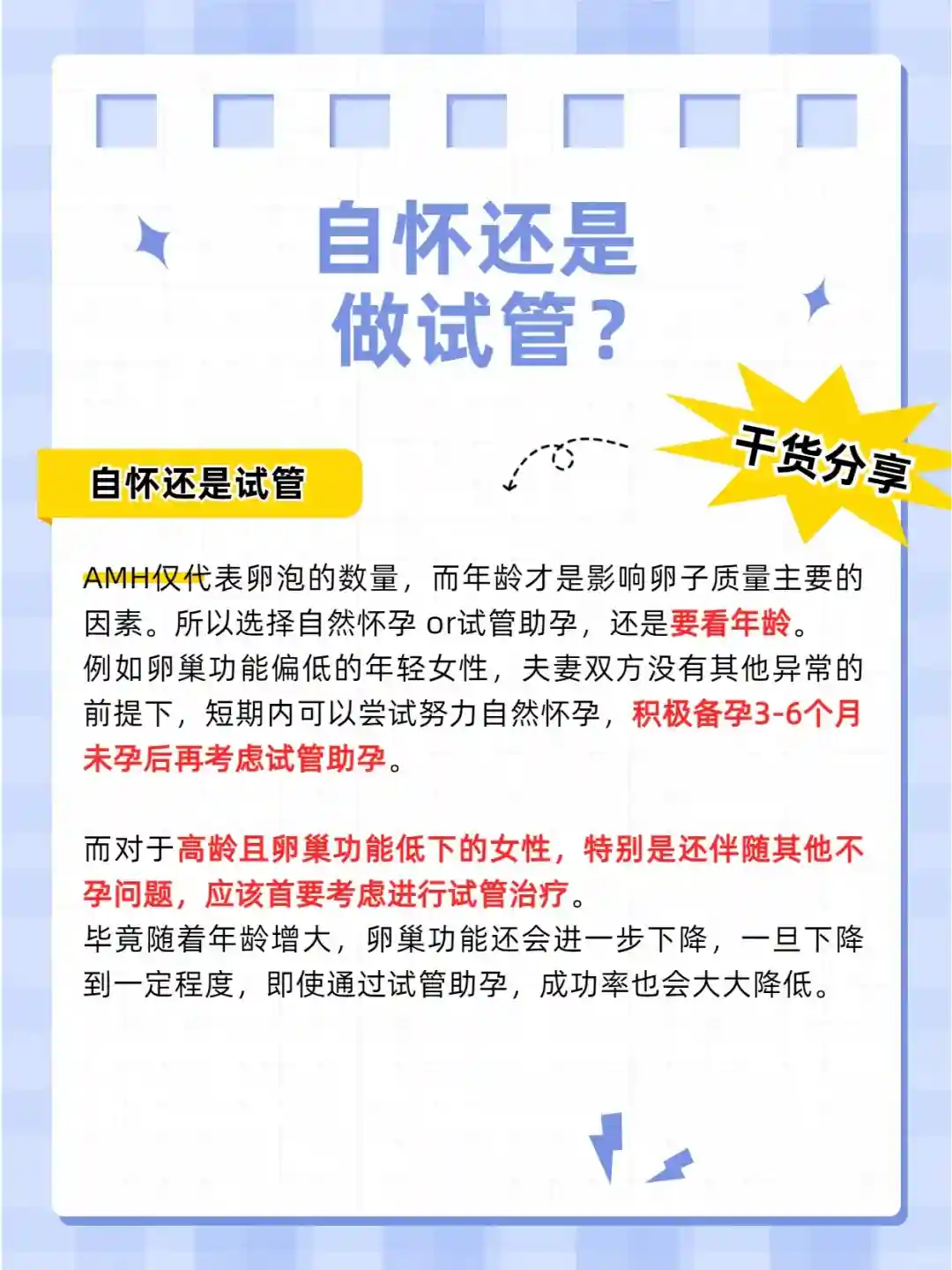 AMH仅代表卵泡的数量,而年龄才是影响卵子质量主要的因素。所以选择自然怀孕 or试管助孕,还是要看年龄。