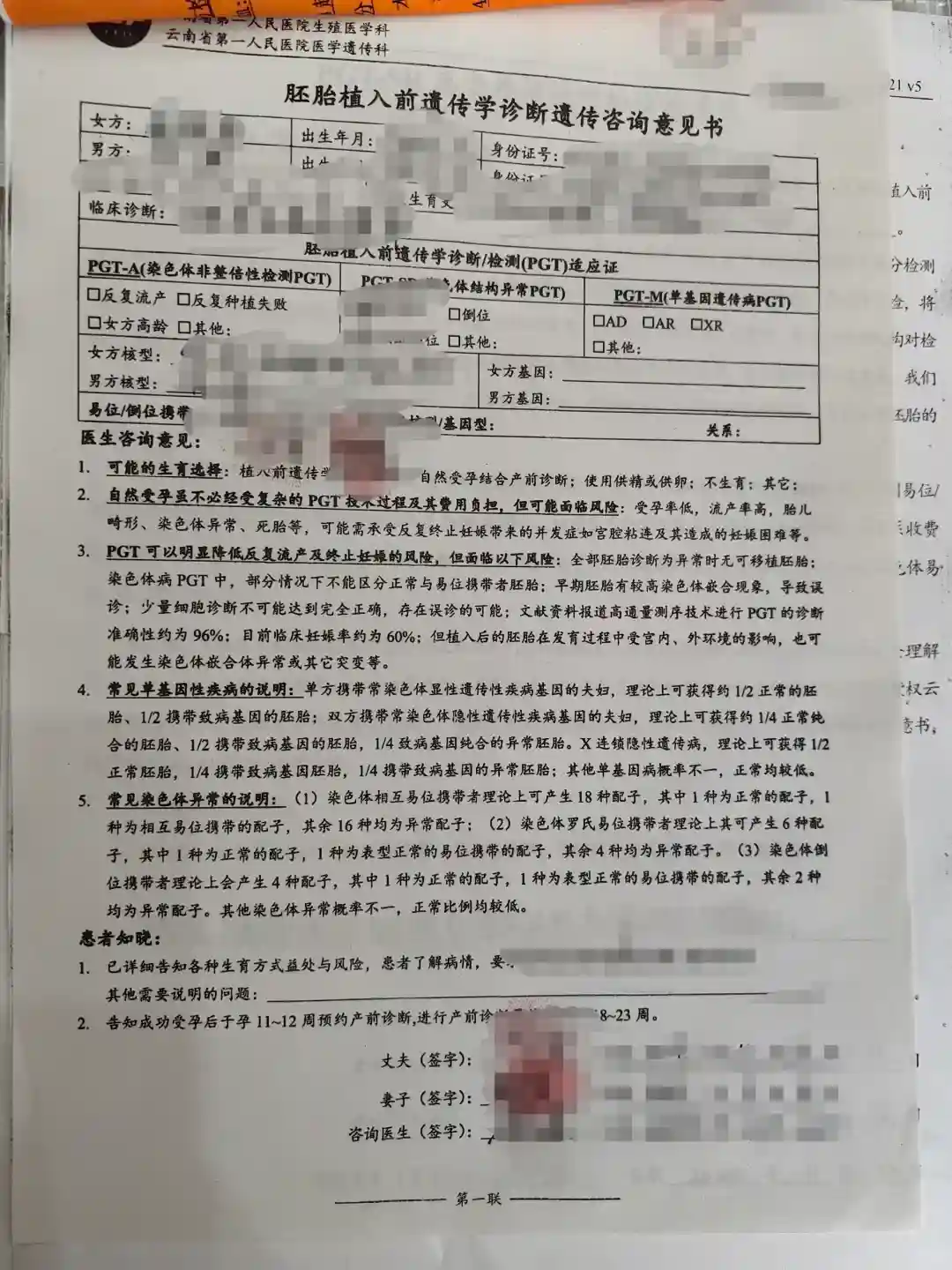 因为如果有可能,不想让我的后代再经历一次我的难,所以我们选择了二筛的方案。其中,如果仅做一筛,则昆华就可以自己做;如果要选择二筛方案,则从一筛开始就需要外检,然后根据外检一筛的情况再开展二筛(当然费用也是按照每个过程单独支付的)。同时最佳方案是提供易位方父母双方的染色体资料,因为我是罗氏,所以李主任说可以在地州安排检查,如果是其他的易位或是更复杂染色体问题,建议在昆华检查,准确性会更高一些;当然如不能提供父母双方的报告或是属于基因突变的,可以采用其他方案如胚胎互推等,不过具体二筛费用需要根据实际情况看。