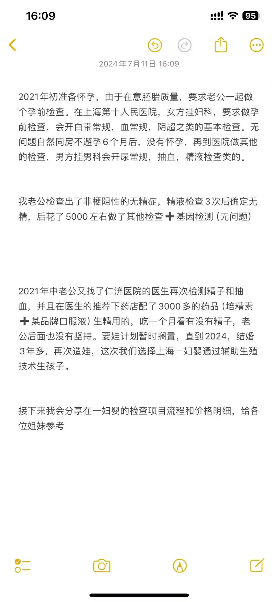 2021年中老公又找了仁济医院的医生再次检测精子和抽血,并且在医生的推荐下药店配了3000多的药品(培精素➕某品牌口服液)生精用的,吃一个月看有没有精子,老公后面也没有坚持。要娃计划暂时搁置,直到2024,结婚3年多,再次造娃,这次我们选择上海一妇婴通过辅助生殖技术生孩子。