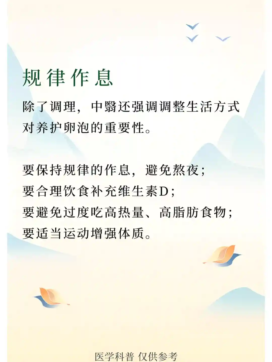 除了调理,中医还强调调整生活方式,对于养护卵泡的重要性。要保持规律的作息,避免熬夜;合理饮食补充维生素D;避免过度吃高热量、高脂肪食物;适当运动增强体质。