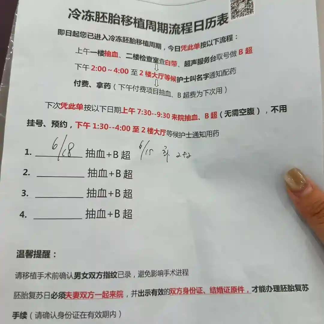 6.15降调后第一次返院。开了当天的白带检查,抽血和b超!然后去护士台办理进入移植周期,签字、提交夫妻双方身份证和结婚证复印件!然后去检查,等待下午的报告!开始吃补佳乐!