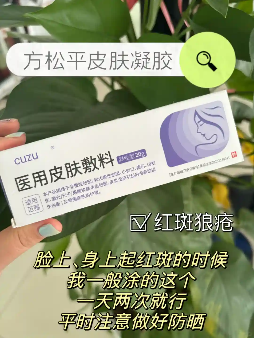 面部和手臂出现红疹的时候,我一般会涂方松平皮肤凝胶,每次湿毛巾擦拭皮肤后涂上,一天两次就行