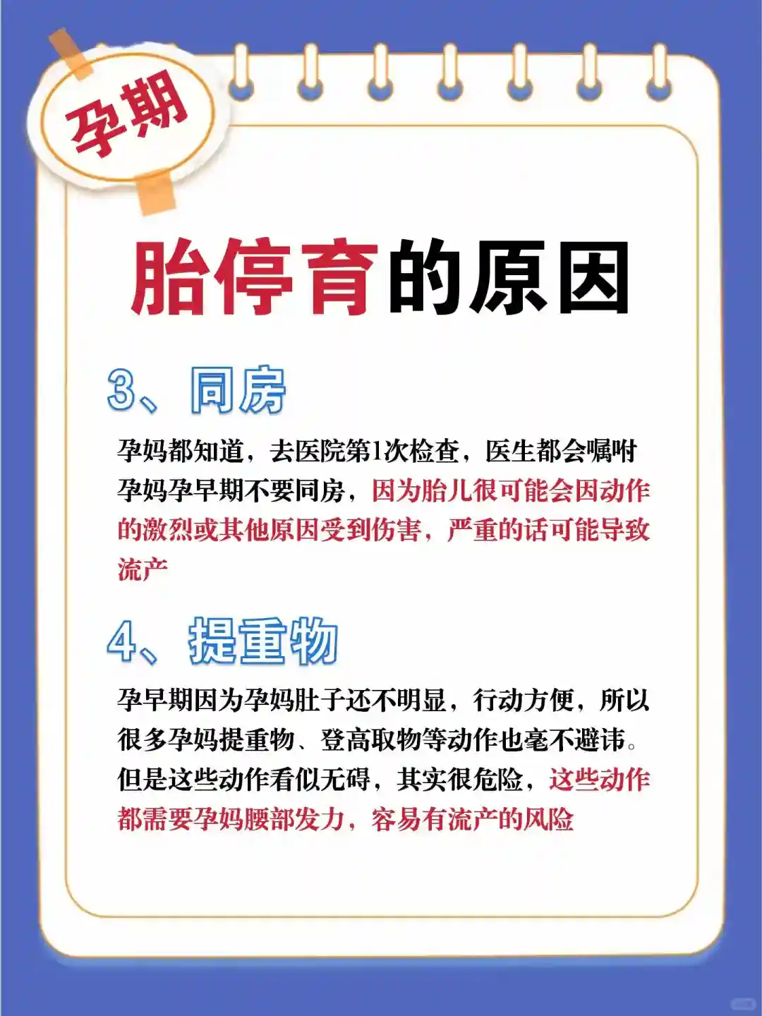 孕早期因为孕妈肚子还不明显,行动方便,所以很多孕妈提重物、登高取物等动作也毫不避讳。但是这些动作看似无碍,其实很危险,这些动作都需要孕妈腰部发力,容易有流产的风险