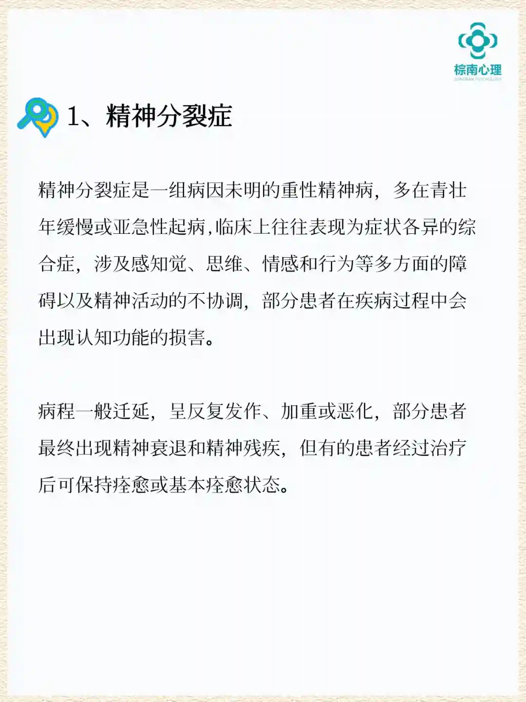 其实除了精分外,有六种重性精神疾病,这六种精神障碍,症状严重,会导致患者社会适应等功能严重损害、对自身健康状况或者客观现实不能完整认识,或者不能处理自身事务。