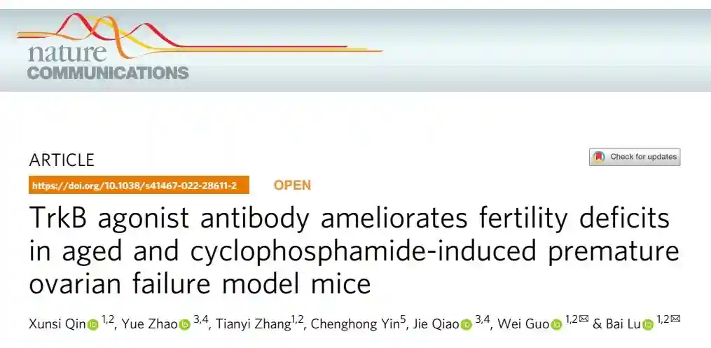 2022年2月17日,清华大学药学院鲁白教授团队在Nature Communications期刊上发表了题为:TrkB agonist antibody ameliorates fertility deficits in aged and cyclophosphamide-induced premature ovarian failure model mice 论文。