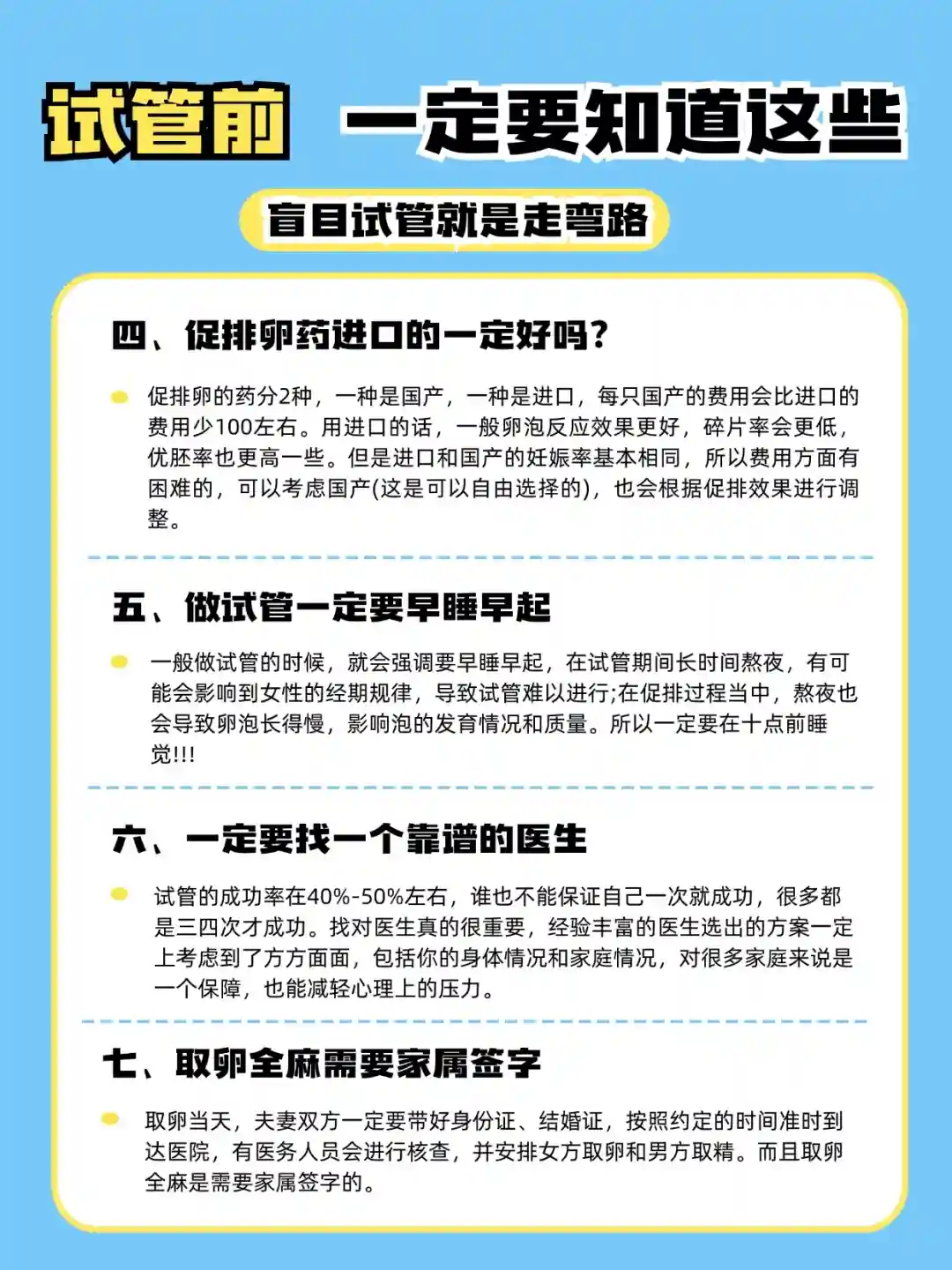 5️⃣、做试管一定要早睡早起一般做试管的时候,就会强调要早睡早起,在试管期间长时间熬夜,有可能会影响到女性的经期规律,导致试管难以进行;在促排过程当中,熬夜也会导致卵泡长得慢,影响泡的发育情况和质量。所以一定要在十点前睡觉!!!