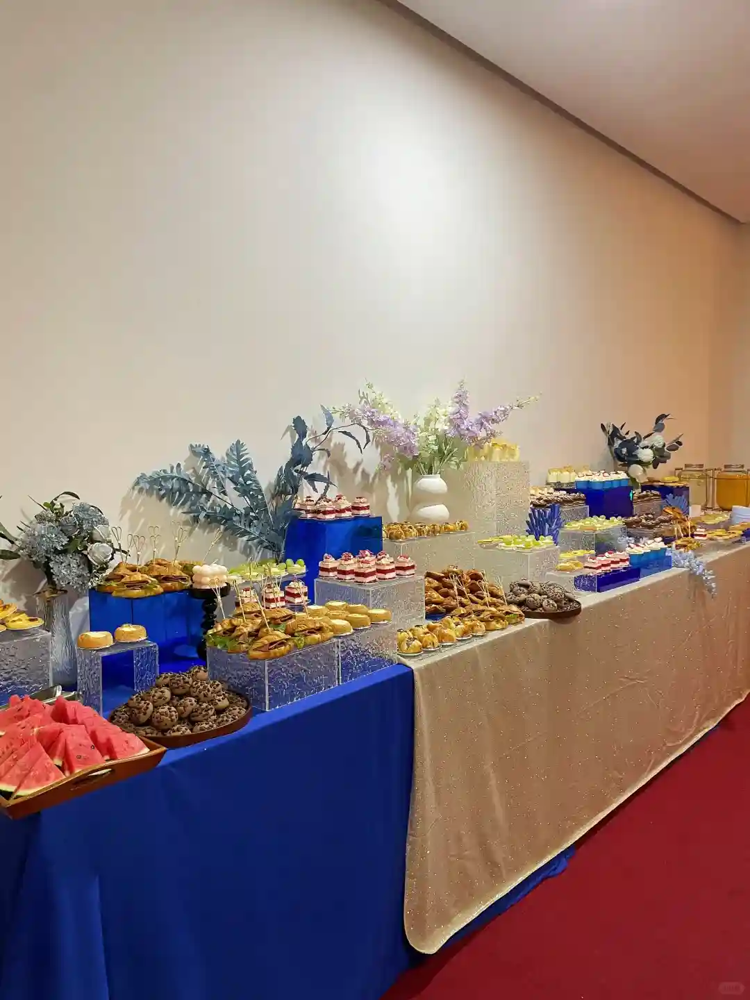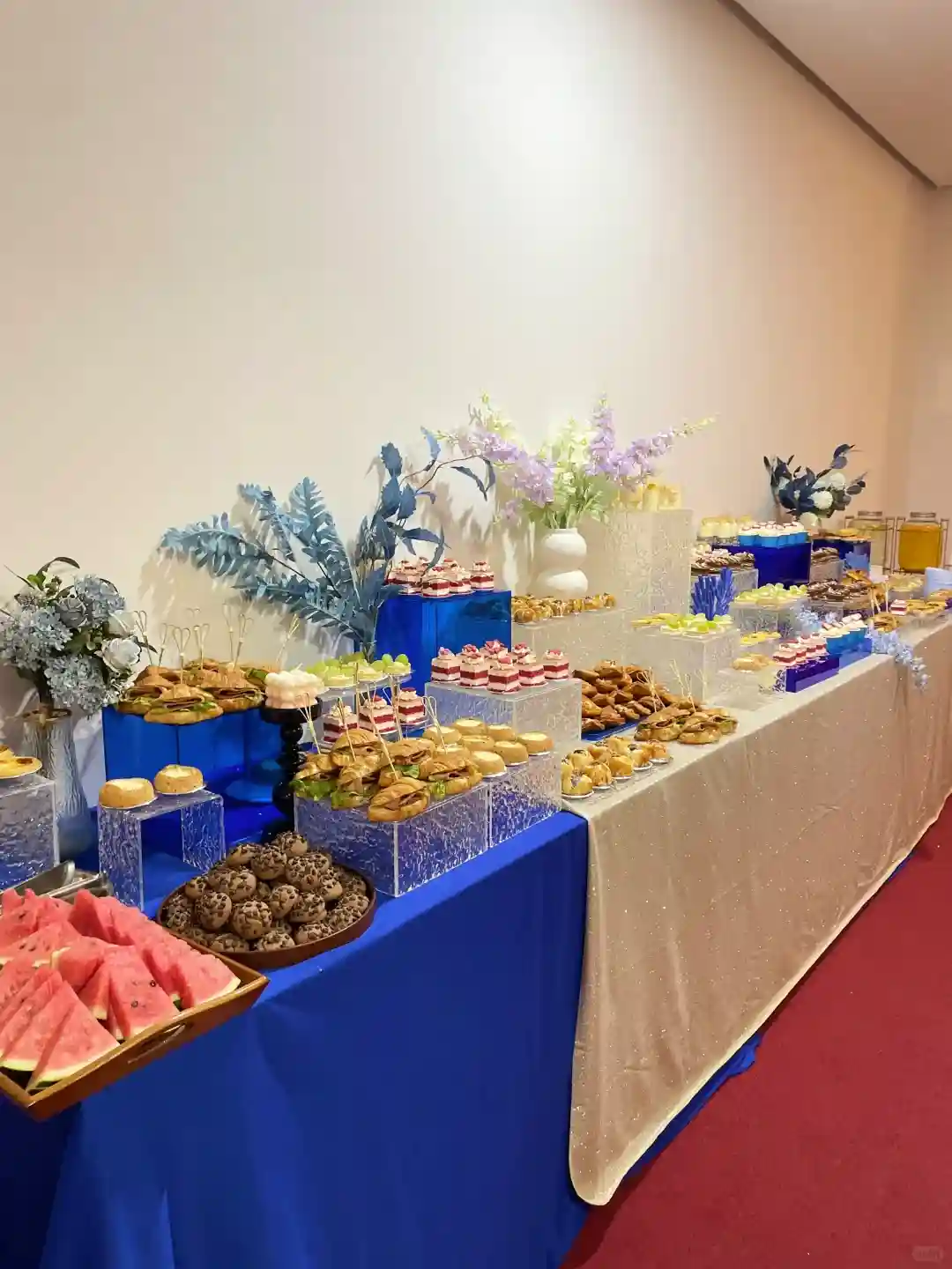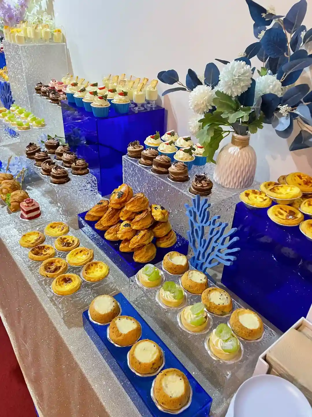 🍽️ 一走进会场,就被那些精致的美食吸引了!甜点和小吃琳琅满目,色彩缤纷得让人眼花缭乱。特别是那些蓝色系的点心,简直是艺术品,与整个蓝色主题完美融合,让我忍不住拍了好多照片!
