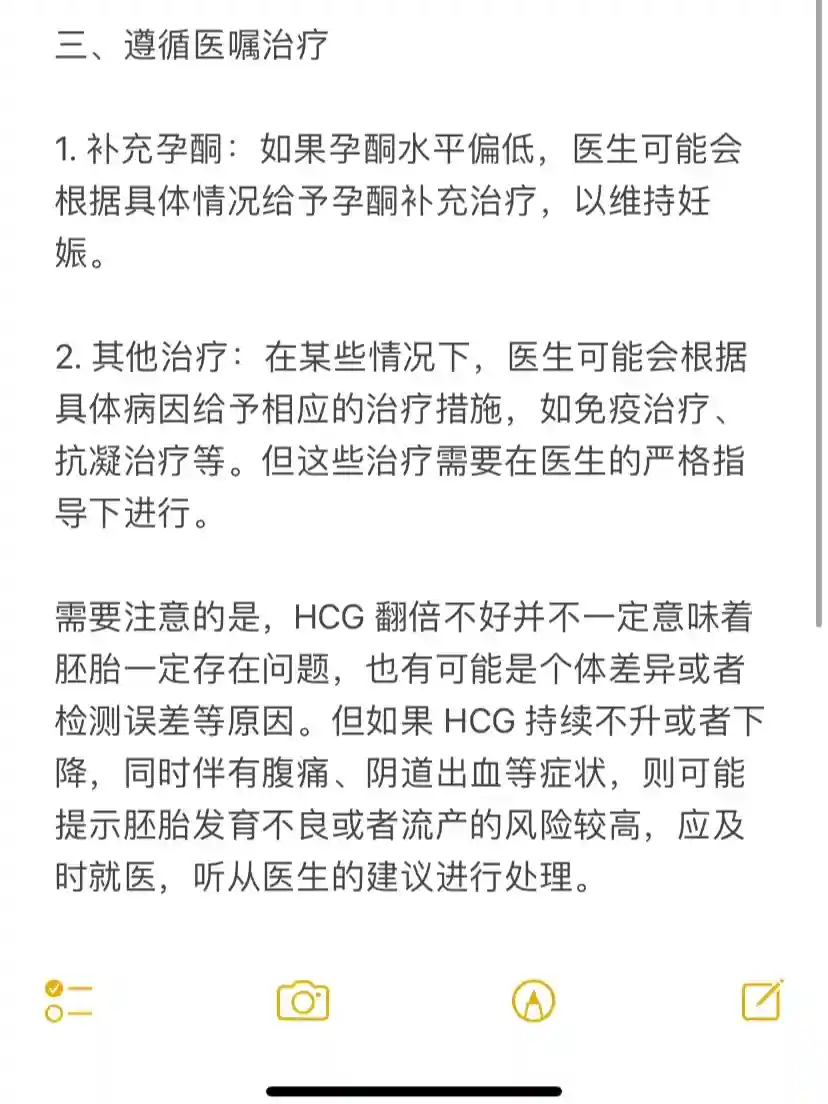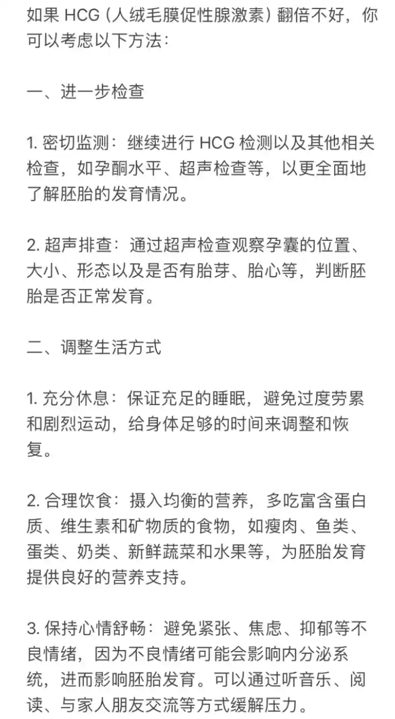 需要注意的是,HCG 翻倍不好并不一定意味着胚胎一定存在问题,也有可能是个体差异或者检测误差等原因。但如果 HCG 持续不升或者下降,同时伴有腹痛、阴道出血等症状,则可能提示胚胎发育不良或者流产的风险较高,应及时就医,听从医生的建议进行处理。#hgg