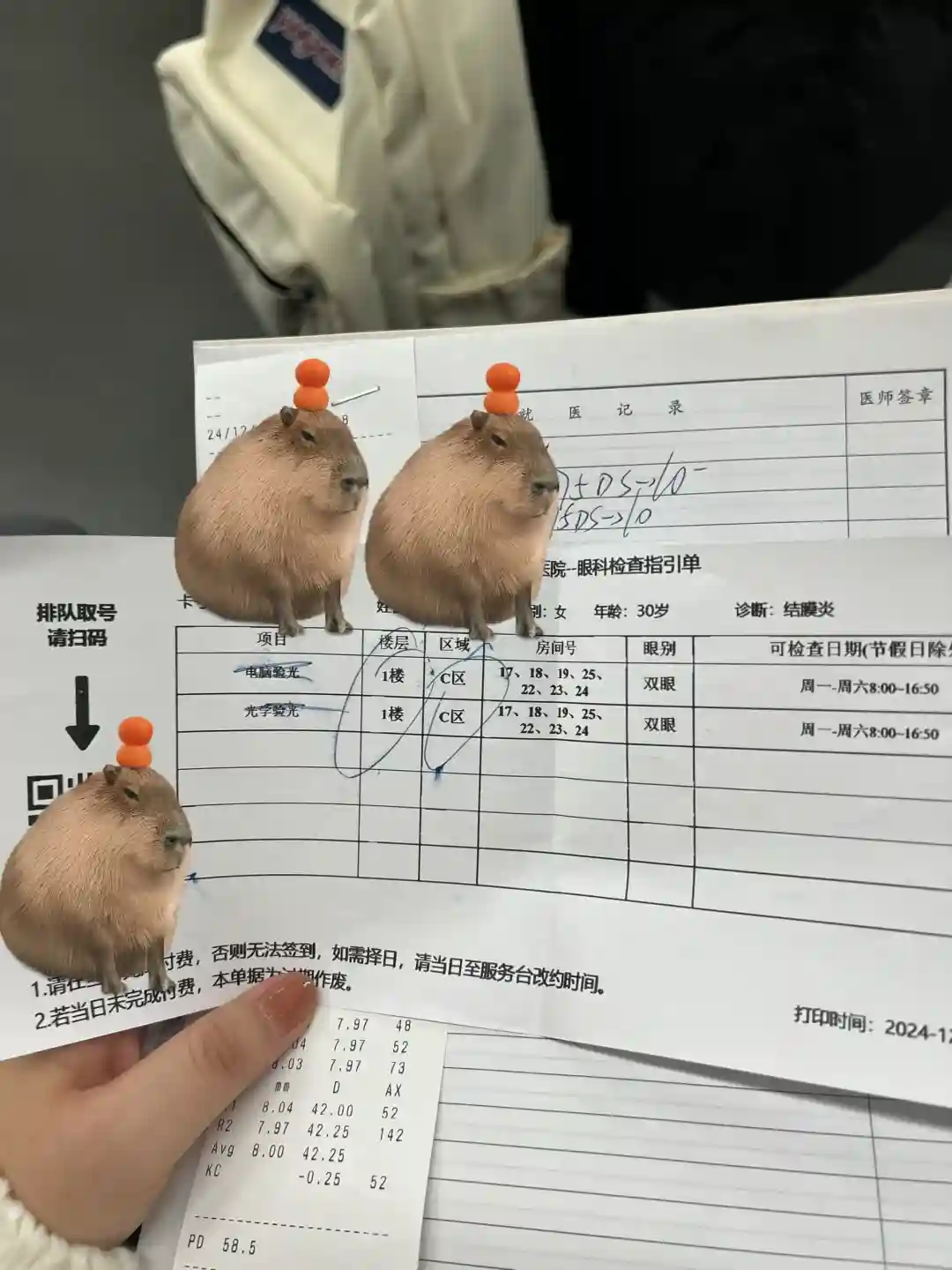 5️⃣因为眼镜带了三四年了想重新验光,医生开好眼药水以后,可以顺便开验光(电脑验光➕光学验光)。在机器缴费以后,在1楼药房拿药(注意有的眼药水需要放冰箱)。在1楼C区排队验光同样是扫单子上的二维码排队。