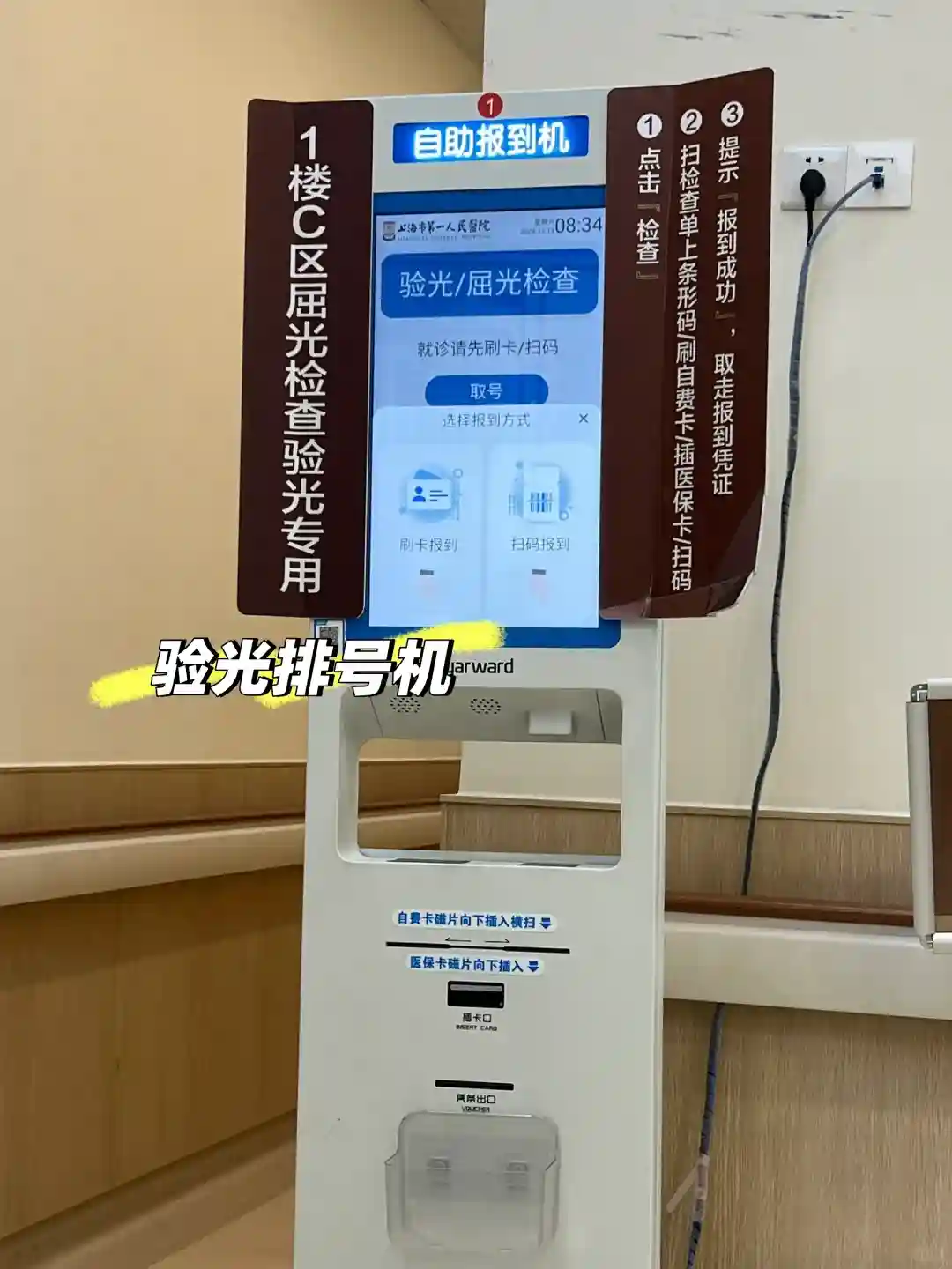 如果医生开了其他相关检查后,每个检查室的门口都会有签到机器,需要签到才可以排队做检查,同样是等医生叫号,医生给的单子上有二维码,扫这个二维码就可以签到排队。