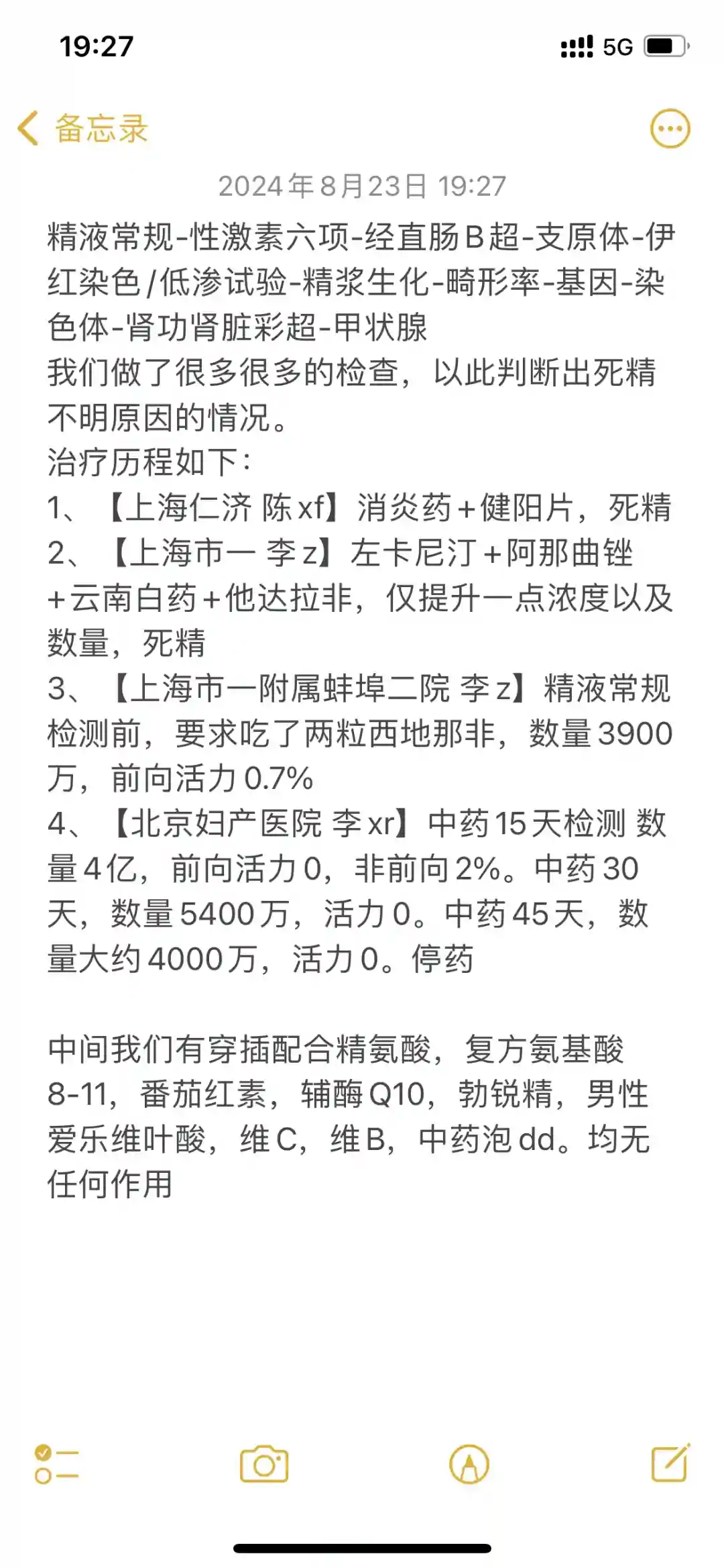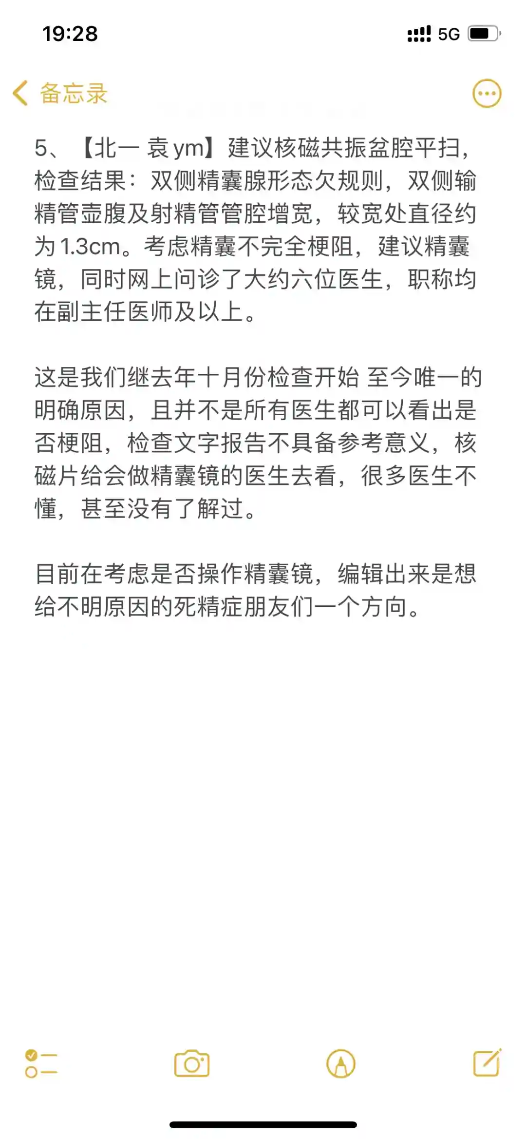 目前在考虑是否操作精囊镜,编辑出来是想给不明原因的死精症或者极度弱精朋友们一个参考,不能说每个人都是这个原因,或者说其他医生开的药对我没用,对你们就没用,不同情况不同处理,只能说这起码是一个方向,也是我和我爱人一路试错过来的结果,希望大家好孕