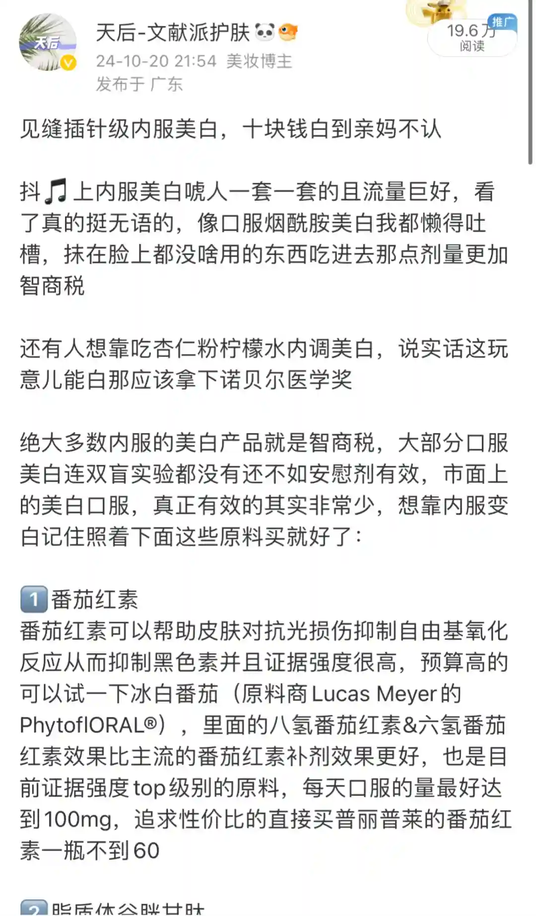 绝大多数口服美白连双盲实验都没有还不如安慰剂有效,市面上的美白口服,真正有效的其实非常少,想靠内服变白记住照着下面这些原料买就好了: