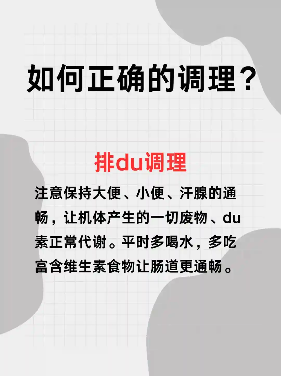 注意保持大便、小便、汗腺的通畅,让机体产生的一切废物、du素正常代谢。平时多喝水,多吃富含维生素食物让肠道更通畅。