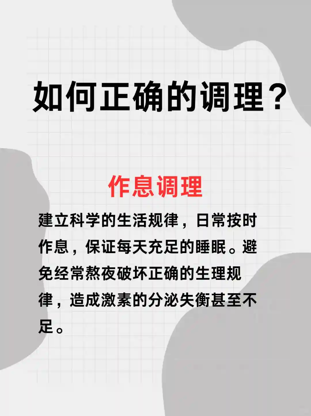 建立科学的生活规律,日常按时作息,保证每天充足的睡眠。避免经常熬夜破坏正确的生理规律,造成激素的分泌失衡甚至不足。