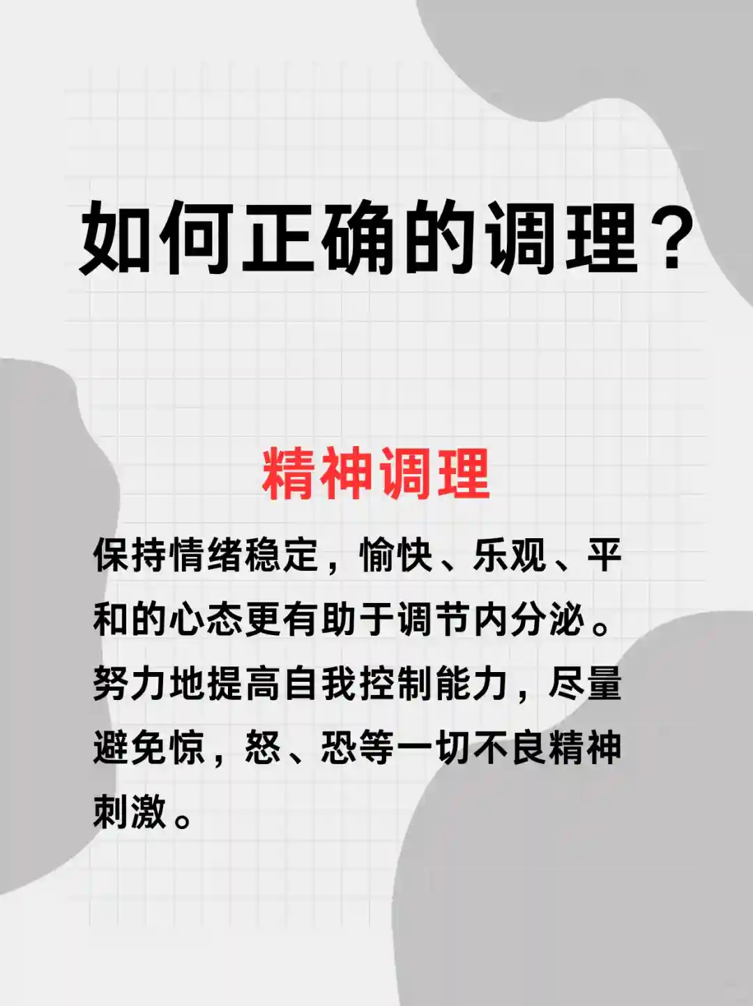 保持情绪稳定,愉快、乐观、平和的心态更有助于调节内分泌。努力地提高自我控制能力,尽量避免惊,怒、恐等一切不良精神刺激。