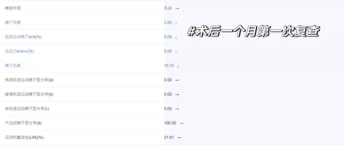 后来,基因检测结果都出来,都没问题,医生又说,基因没问题的话,大概率就是克氏综合症,也是一样的结果,要么显微取精,也不一定能取到,要么供精,要么领养,供精和领养,我是不考虑的。为了寻找真正的病因,我们直接做了睾丸穿刺,看看到底是梗阻性无精症,还是非梗阻性无精症,最后检查结果是梗阻性的无精症,也有很多人说,不要做输精管疏通手术了,浪费时间,浪费钱,就算手术成功了,自然怀孕的概率也很低,建议直接试管,我对试管有点抗拒,我觉得试管🧪对母体的伤害太大了,所以,我还是优先选择让我老公做疏通手术,手术不成功,过两年,真的特别想要孩子,也是可以试管的。我在网上开始找医院,了解了很多之后,确认了郑大一附院,张天标主任,7月份做的手术,手术结束,住院了大概1周就出院了,手术费加上其他的所有费用大概是2.3w左右,出院后开了一个月的药,吃完了再去复查,第一次术后复查,有精子了,但是都是死的,都是不动的,医生说,只要有精子了,就好办了,又开了一个月的药,第二次复查,精子有活力了,但是,精子数量又下降了,所以,又开了一个月要,继续一个月后复查。