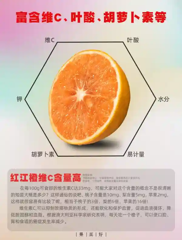 红江橙维C含量高,在每100g可食部的维生素C达33mg,可能大家对这个含量的概念不是很清晰的知道大概是多少?这样通俗的说吧,桃子含量是10mg,梨含量5mg,苹果2mg,这样就很容易有比较了呢,相当于桃子的3倍,梨的6倍,苹果的16倍!