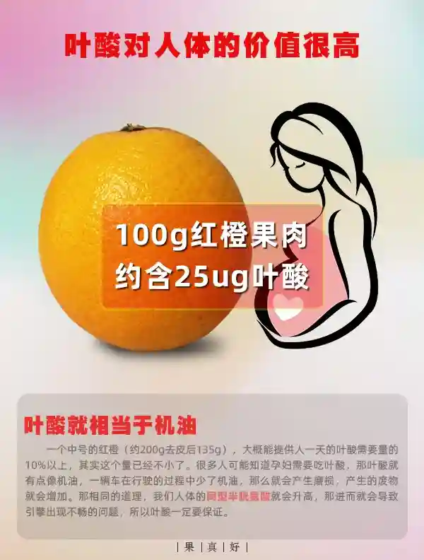 叶酸就相当于机油,100g红橙果肉,约含25ug叶酸。 一个中号的红橙(约200g去皮后135g),大概能提供人一天的叶酸需要量的10%以上,其实这个量已经不小了。很多人可能知道孕妇需要吃叶酸,那叶酸就有点像机油,一辆车在行驶的过程中少了机油,那么就会产生磨损,产生的废物就会增加。那相同的道理,我们人体的同型半胱氨酸就会升高,那进而就会导致引擎出现不畅的问题,所以叶酸一定要保证。