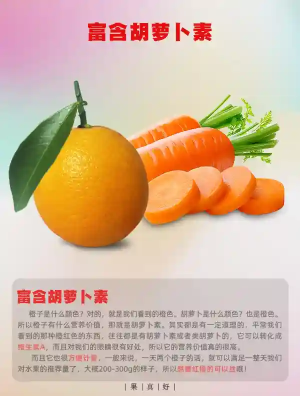 橙子是什么颜色?对的,就是我们看到的橙色。胡萝卜是什么颜色?也是橙色。所以橙子有什么营养价值,那就是胡萝卜素。其实都是有一定道理的,平常我们看到的那种橙红色的东西,往往都是有胡萝卜素或者类胡萝卜的,它可以转化成维生素A,而且对我们的眼睛很有好处,所以它的营养价值真的很高。