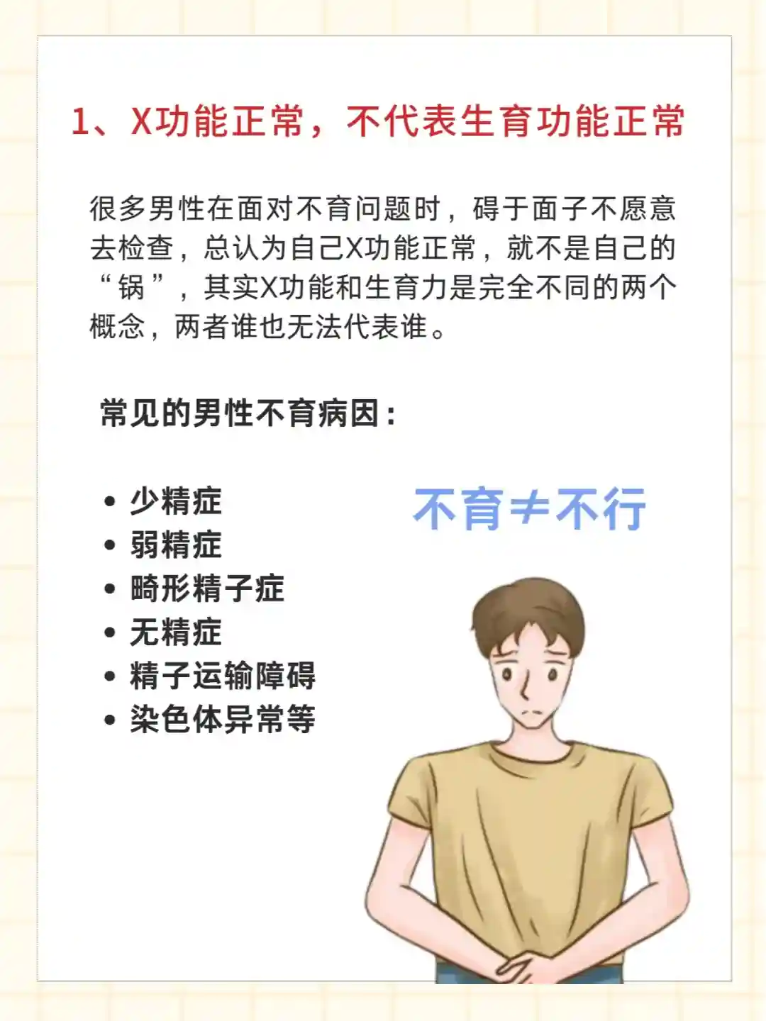 很多男性在面对不育问题时,碍于面子不愿意去检查,总认为自己X功能正常,就不是自己的“锅”,其实X功能和生育力是完全不同的两个概念,两者谁也无法代表谁。