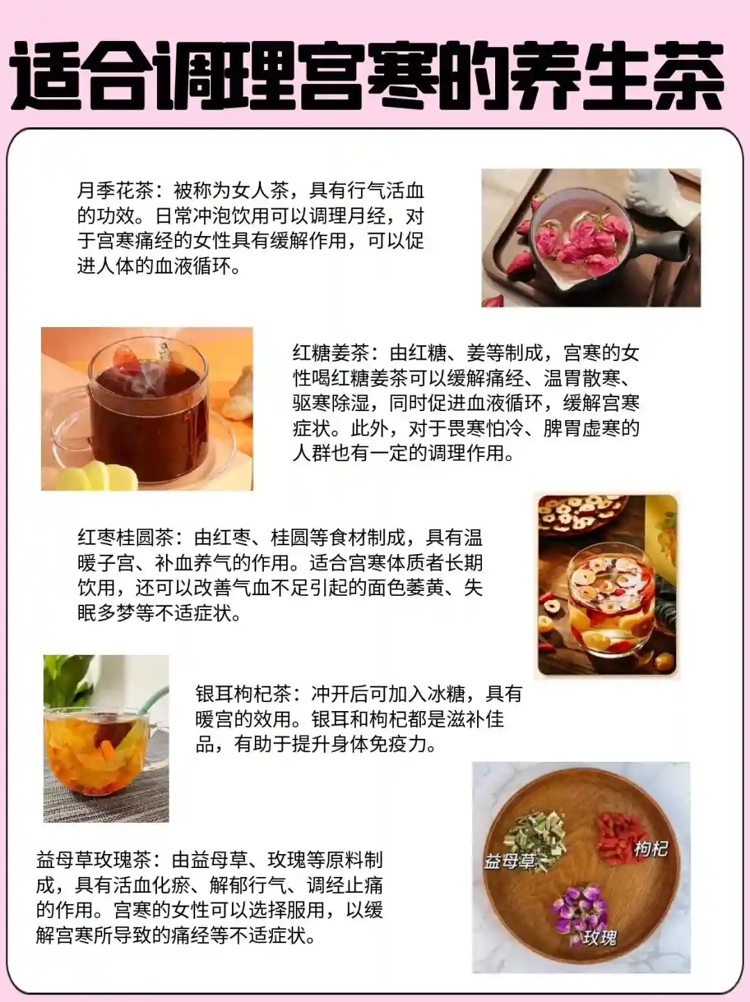益母草玫瑰茶:由益母草、玫瑰等原料制成,具有活血化瘀、解郁行气、调经止痛的作用。宫寒的女性可以选择服用,以缓解宫寒所导致的痛经等不适症状。