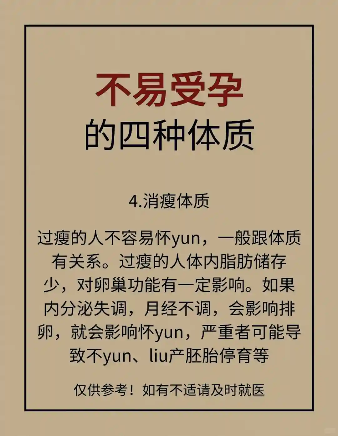 👀消瘦体质:身体脂肪含量过低,可能引起内分泌紊乱,影响雌激素分泌,导致月经不调甚至闭经。要合理饮食,增加营养,适当增肌,让身体达到健康的备孕状态。