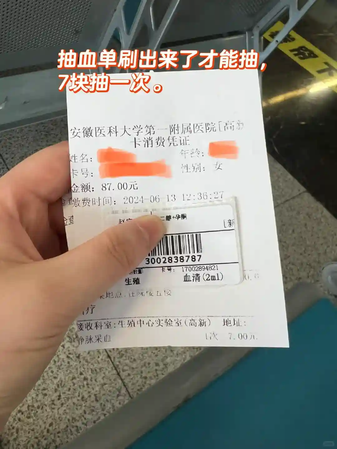 假设主任把下次固定日期的抽血检查已经开到了卡里,可以提前刷出来,如果是试管促排期间,一定要提前刷出来!抽一次血7块。