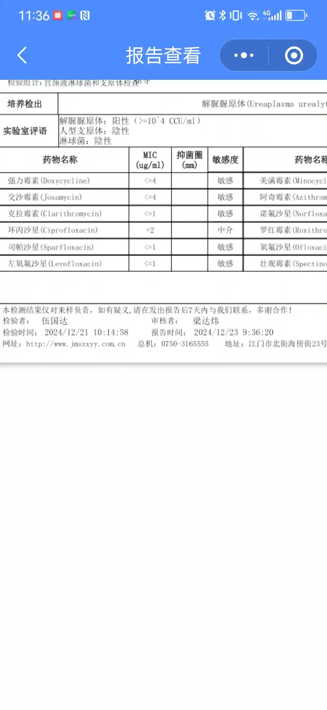 1)支原体复查报告:显示阴性。第一次查出来是阳性,复诊后是阴性,我对第一次检查结果的准确性严谨性有深表怀疑。去三楼检验科了解后,我还是不能理解。我计划提出投诉。