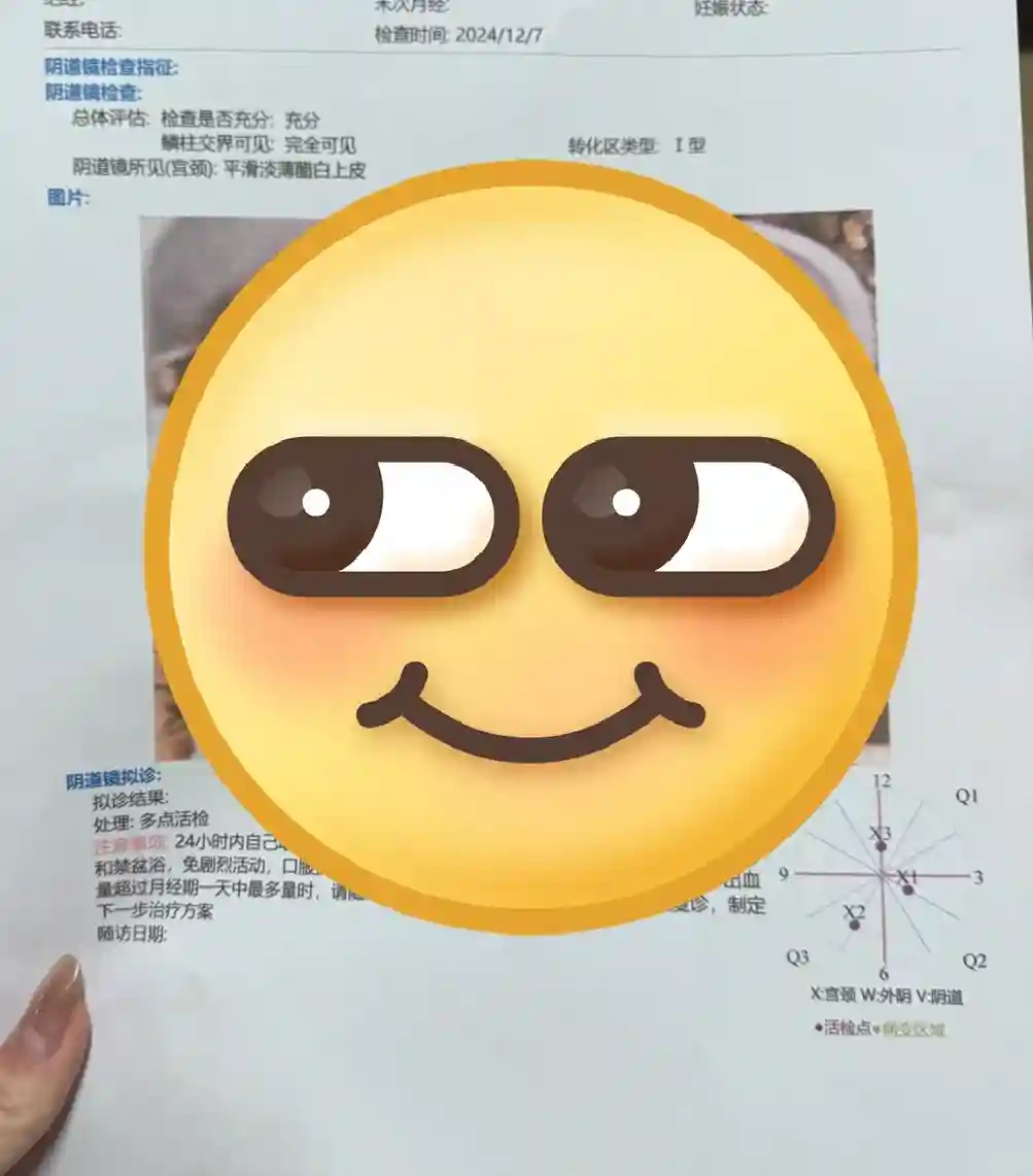 🌟活检过程:我也搜了很多帖子,从查出开始,心里就非常压抑,一方面担心活检的疼痛,一方面担心结果是2-3。 月经后第四天找了主任活检,这里提示大家害怕的话可以叫医生用小号鸭嘴嵌。【撑开后,阴道镜没什么感觉,因为阴道镜不太动,上醋酸能感受到沙一下,可以接受。着色情况三点不好,大夫随即取了三点。取点只能感受到1s的微疼痛,毕竟也揪下一块肉。10分钟结束。整个过程我认为不如hpv检查疼。】