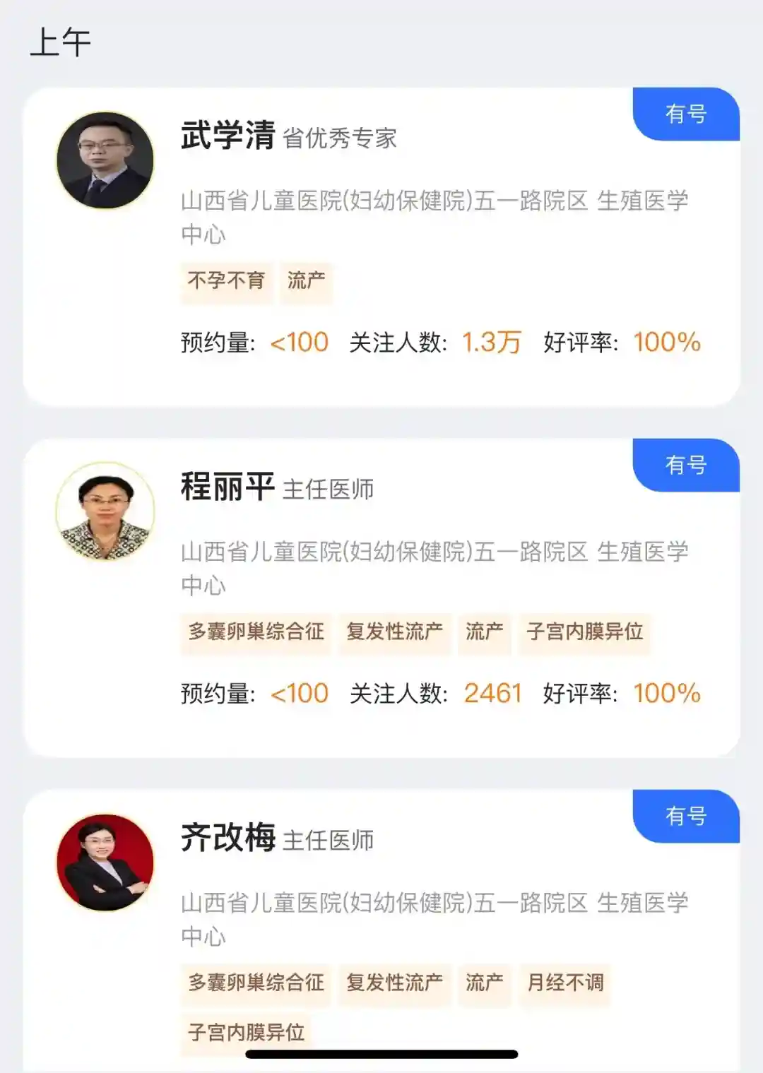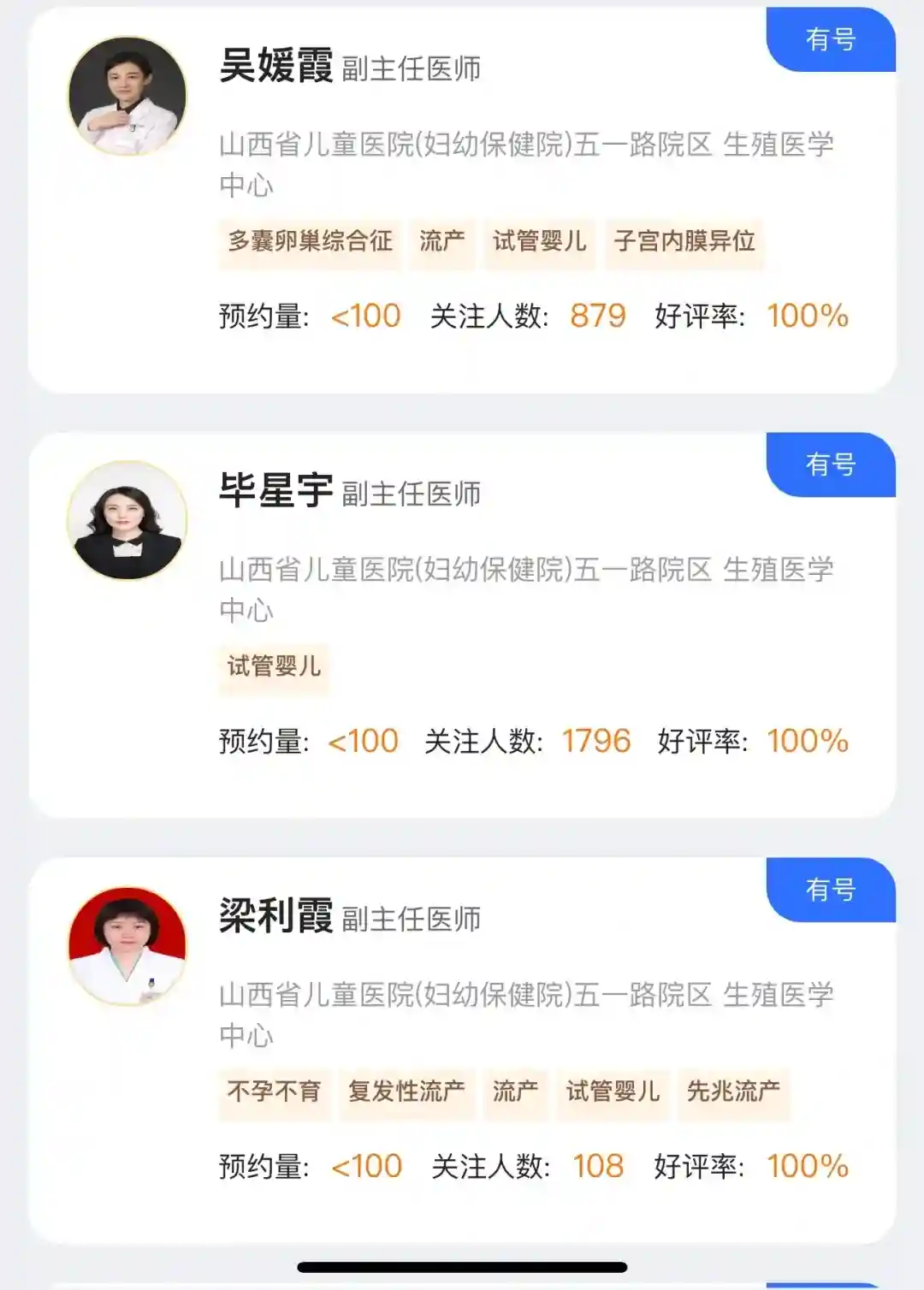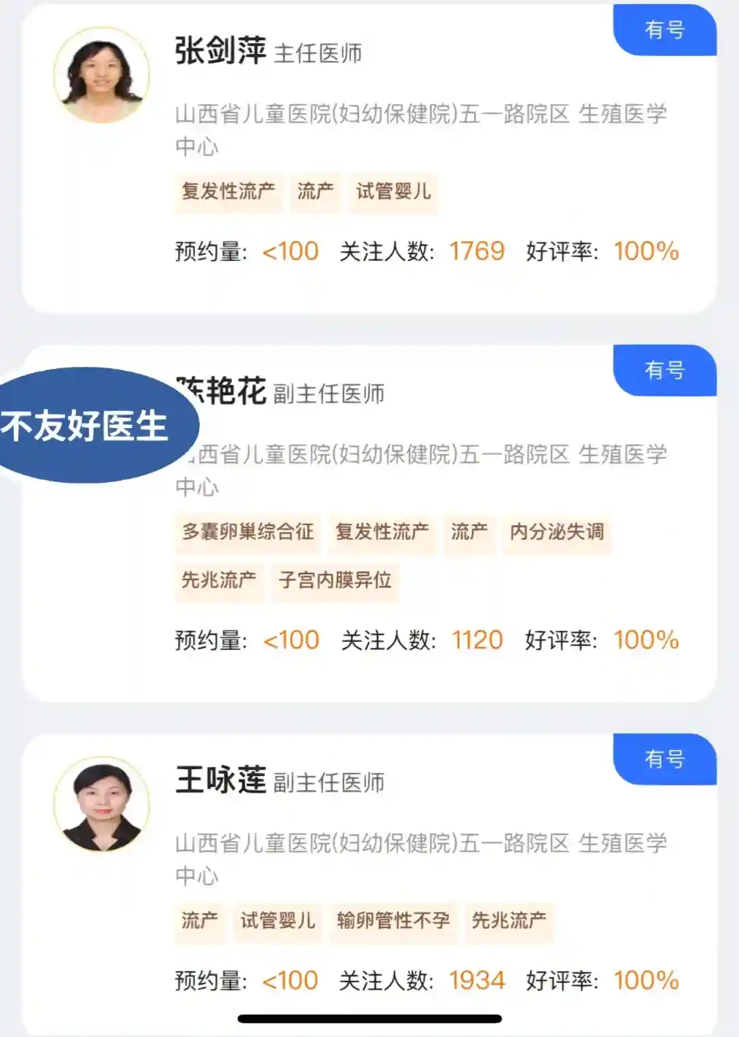去年看的一位名叫陈某花的医生,建议大家绕行!很不好,具体怎么不好咱也不便多说,总之就是不好!给我造成了很严重的心理阴影!花了2000多检查的,几乎没有从陈某花医生那里听到任何有价值的话,很无语!等待是次要的,主要是等待完了也不好好给建议,守口如瓶,问一句回几个字!总之很差劲就是了!大家不要踩坑!好医生很难遇