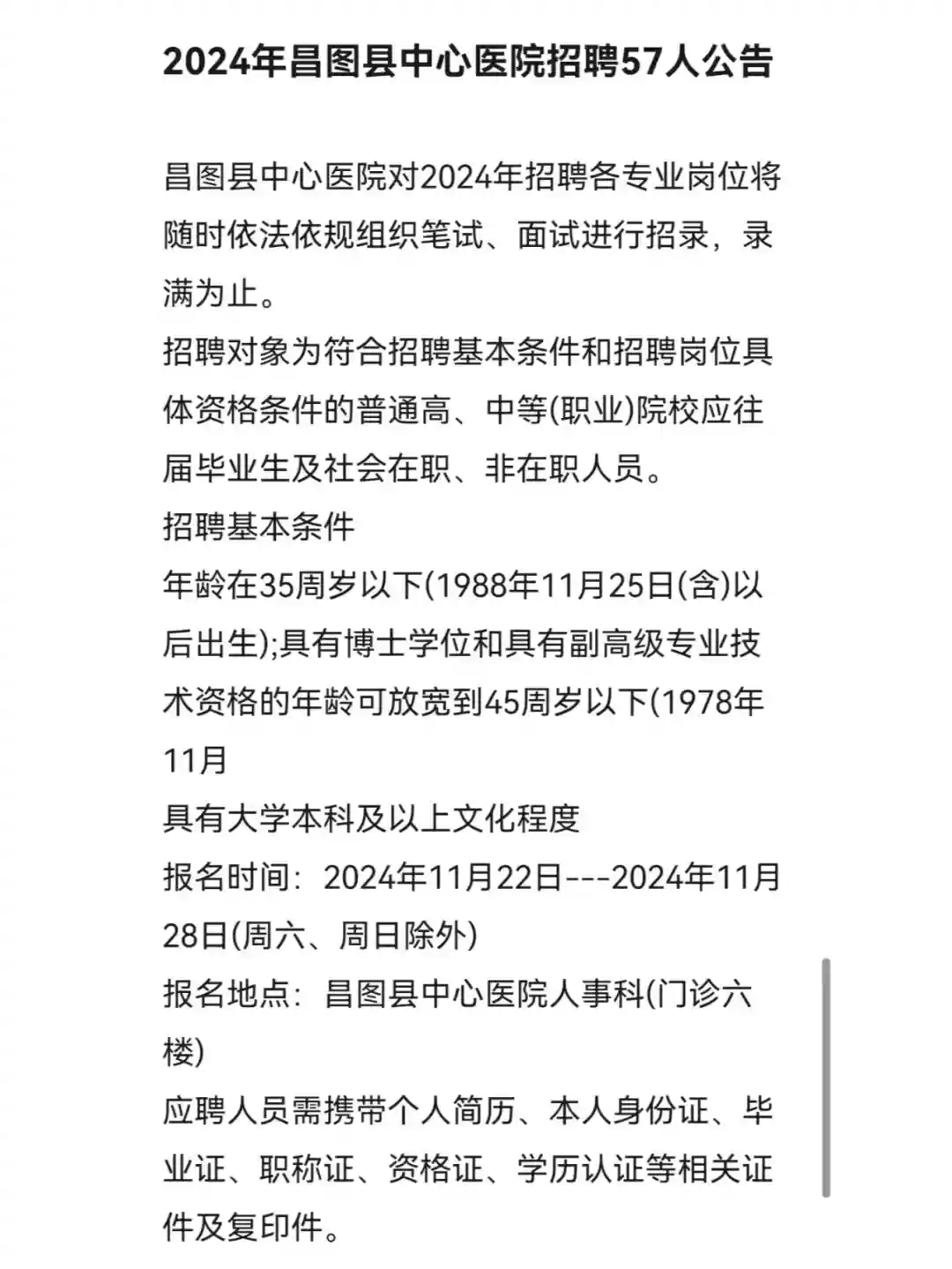 昌图县中心医院对2024年招聘各专业岗位将随时依法依规组织笔试、面试进行招录,录满为止。