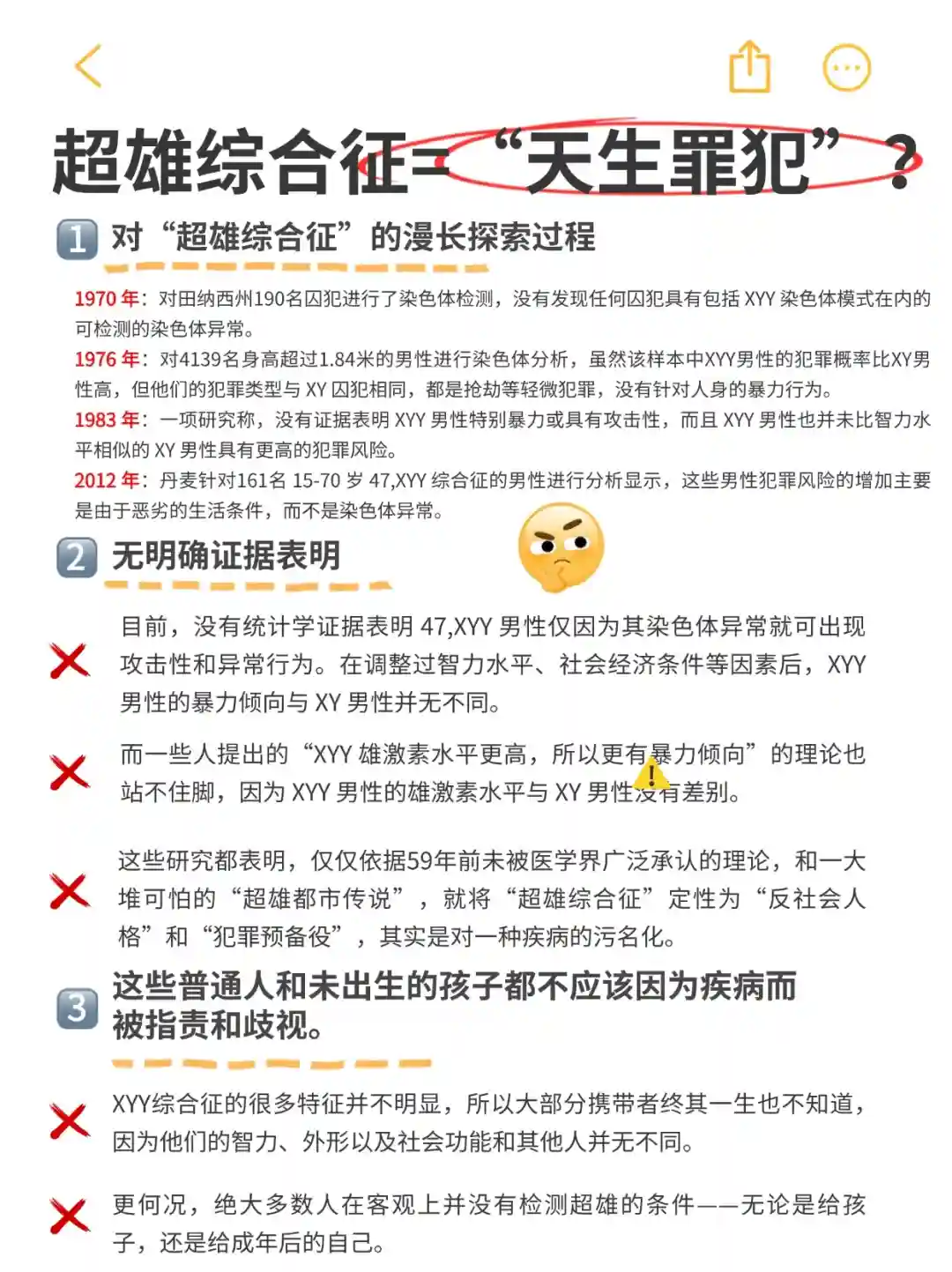 🌟超雄综合征真的是“天生罪犯”吗?(具体信息可看图4)1966年,《柳叶刀》上的一份研究首次将超雄综合征和犯罪行为联系起来。这份研究对315名男性进行了基因检测,发现其中9名男性携带XYY染色体,并且这9人都有精神障碍背景和犯罪行为。