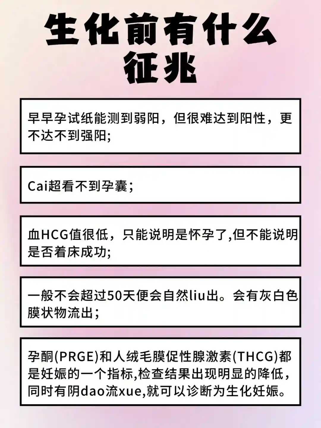 👉 孕酮(PRGE)和人绒毛膜促性腺激素(THCG) 都是妊娠的一个指标,检查结果出现明显的降低,同时有阴dao流xue,就可以诊断为生化妊娠。