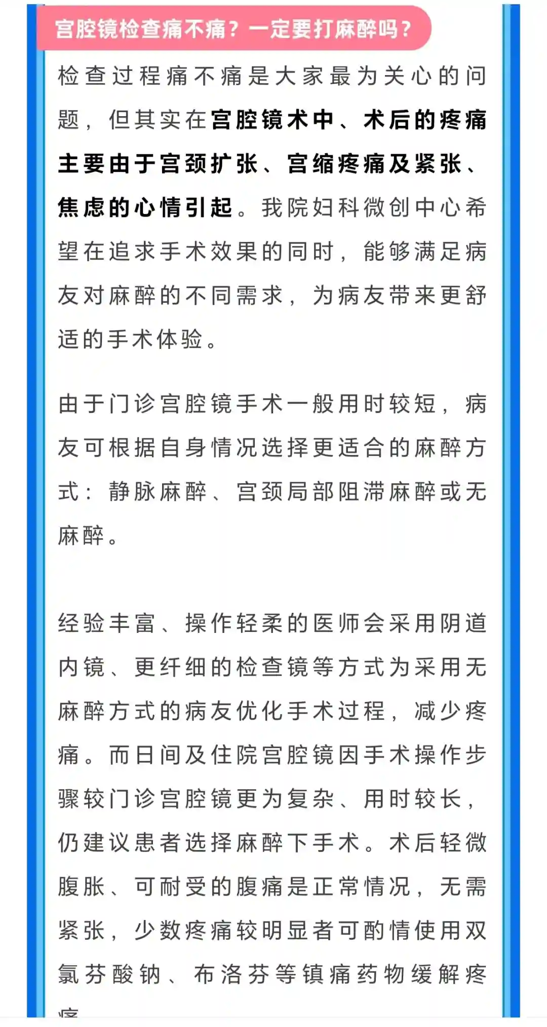 检查过程痛不痛是大家最为关心的问题,说实在的手术哪有不痛的,门诊宫腔镜手术一般用时较短,可根据自身情况选择更适合的麻醉方式:静脉麻醉(全麻)、宫颈局部阻滞麻醉或无麻醉。