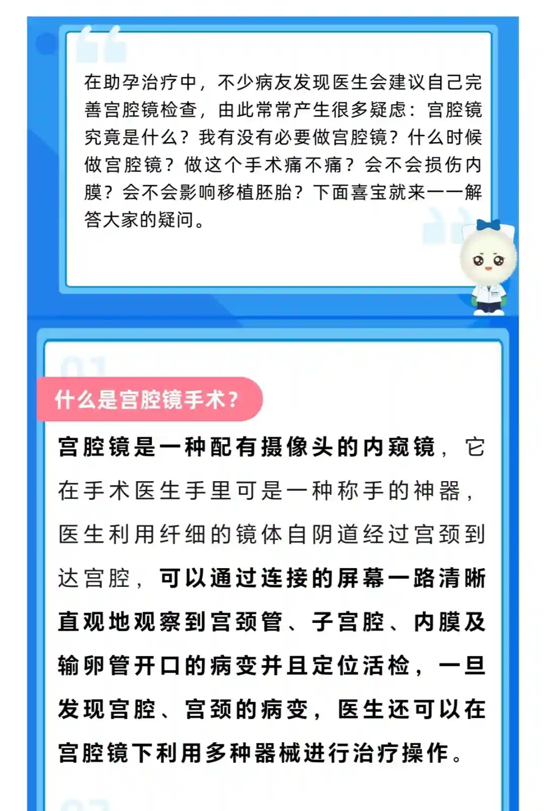 宫腔镜是一种配有摄像头的内窥镜,它在手术医生手里可是一种称手的神器, 医生利用纤细的体自阴道经过宫颈到达宫腔,可以通过连接的屏幕一路清晰直观地观察到宫颈管、子宫腔、内膜及输卵管开口的病变并且定位活检,一旦发现宫腔、宫颈的病变,医生还可以在宫腔镜下利用种器械进行治疗操作。