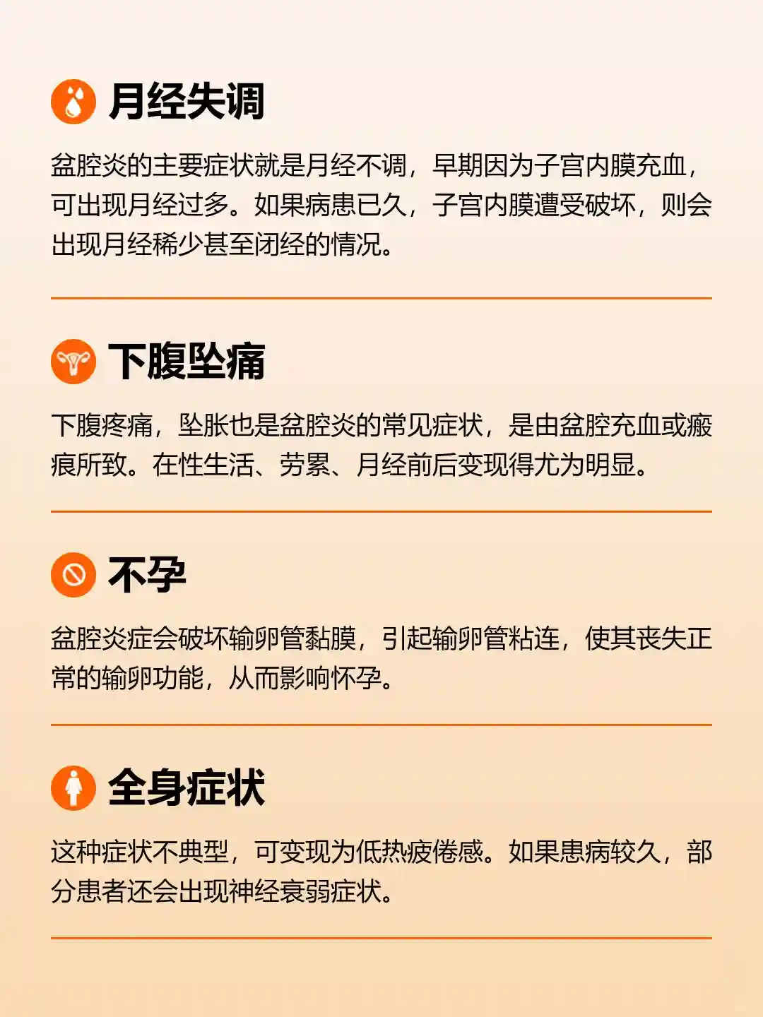 下腹疼痛,坠胀也是盆腔炎的常见症状,是由盆腔充血或瘢痕所致。在性生活、劳累、月经前后变现得尤为明显。