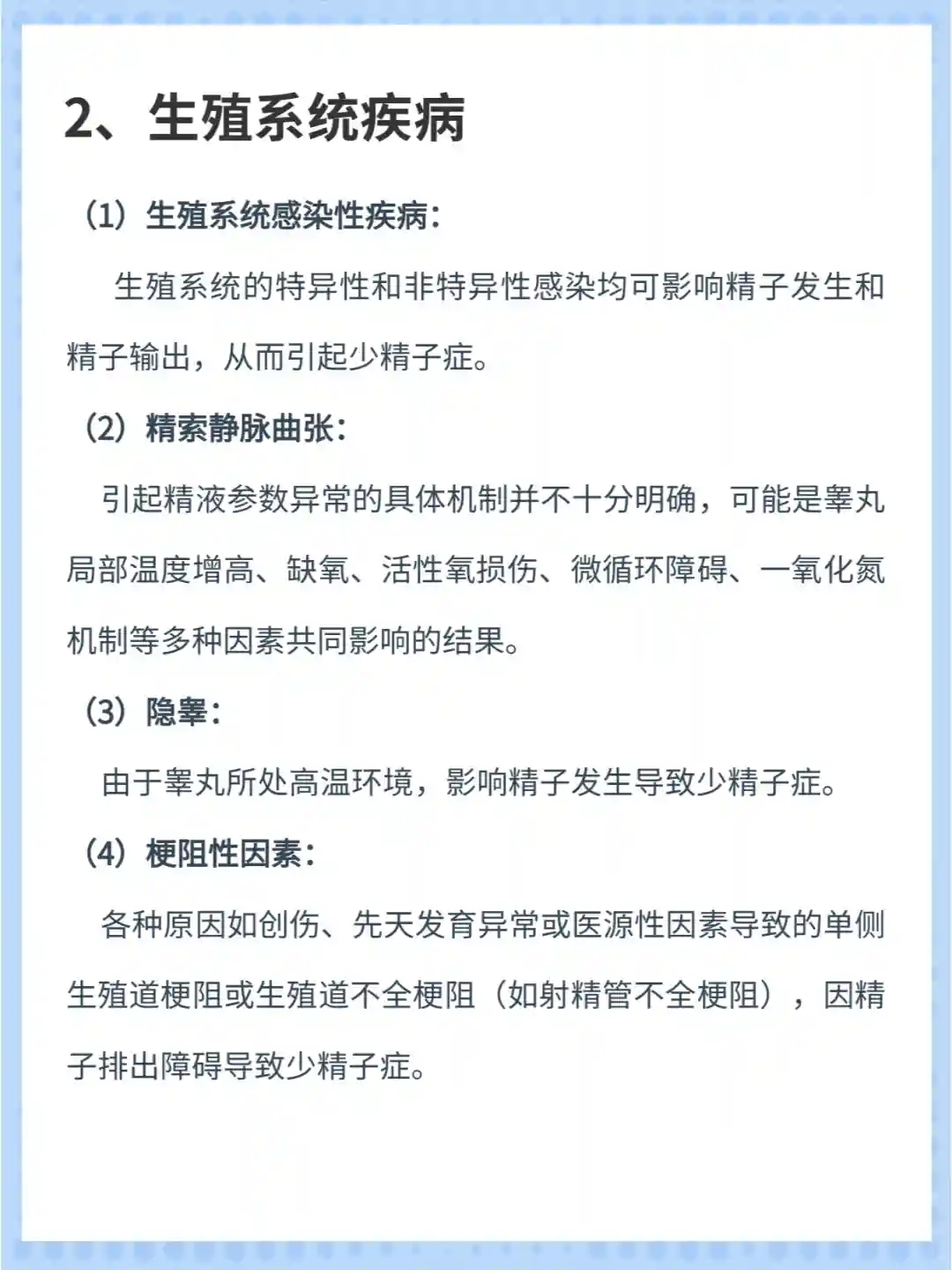 2.生殖系统疾病(1)生殖系统感染性疾病:生殖系统的特异性和非特异性感染均可影响精子发生和精子输出,从而引起少精子症。
