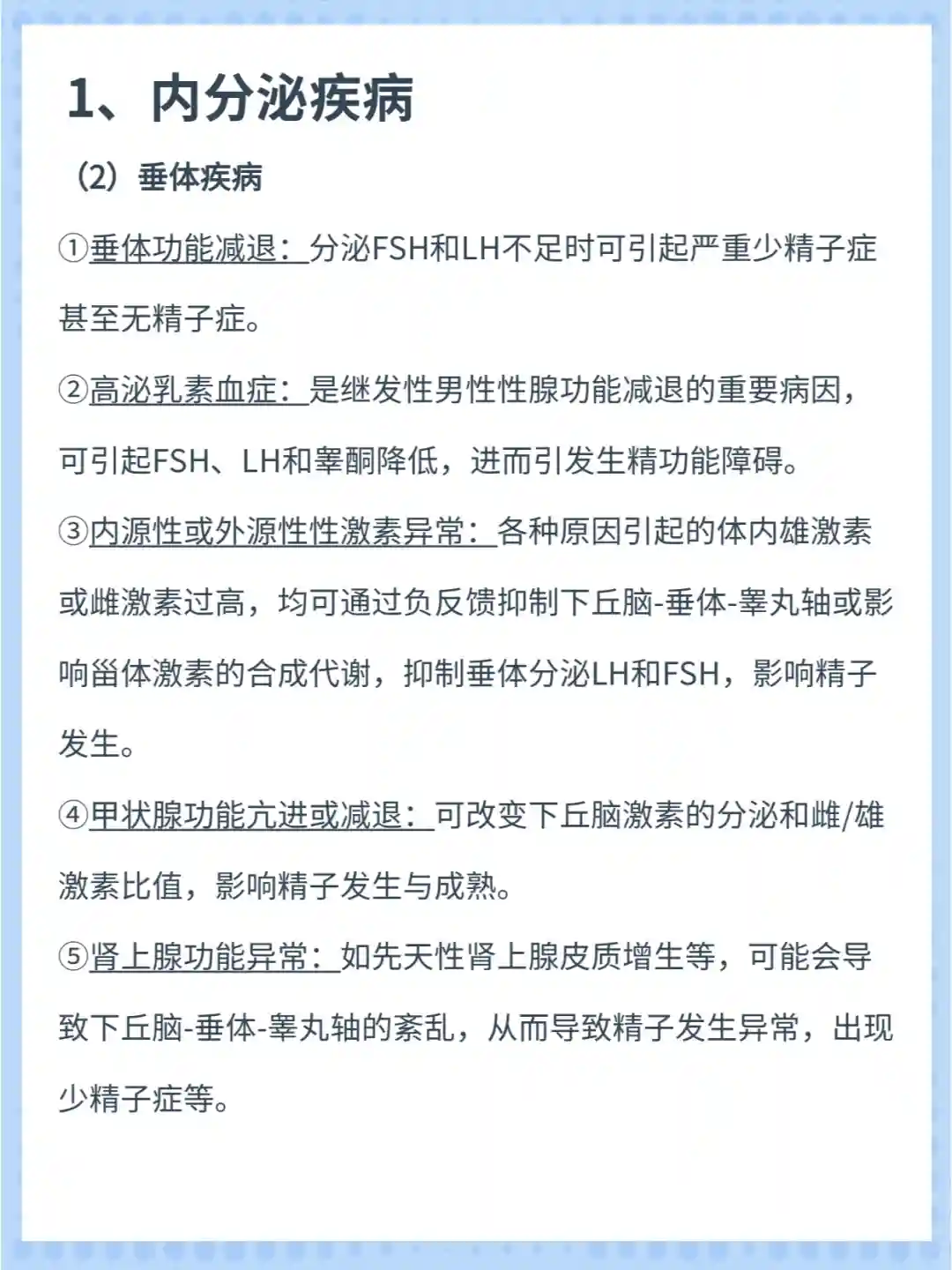 ②高泌乳素血症:是继发性男性性腺功能减退的重要病因,可引起FSH、LH和睾酮降低,进而引发生精功能障碍。