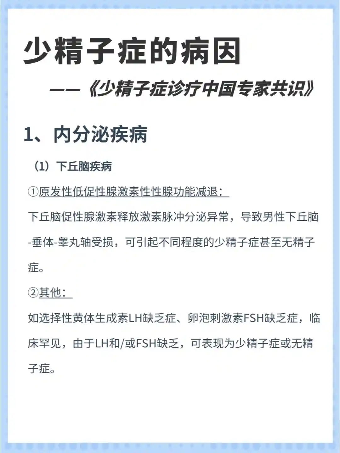 ①原发性低促性腺激素性性腺功能减退:下丘脑促性腺激素释放激素脉冲分泌异常,导致男性下丘脑-垂体-睾丸轴受损,可引起不同程度的少精子症甚至无精子症。