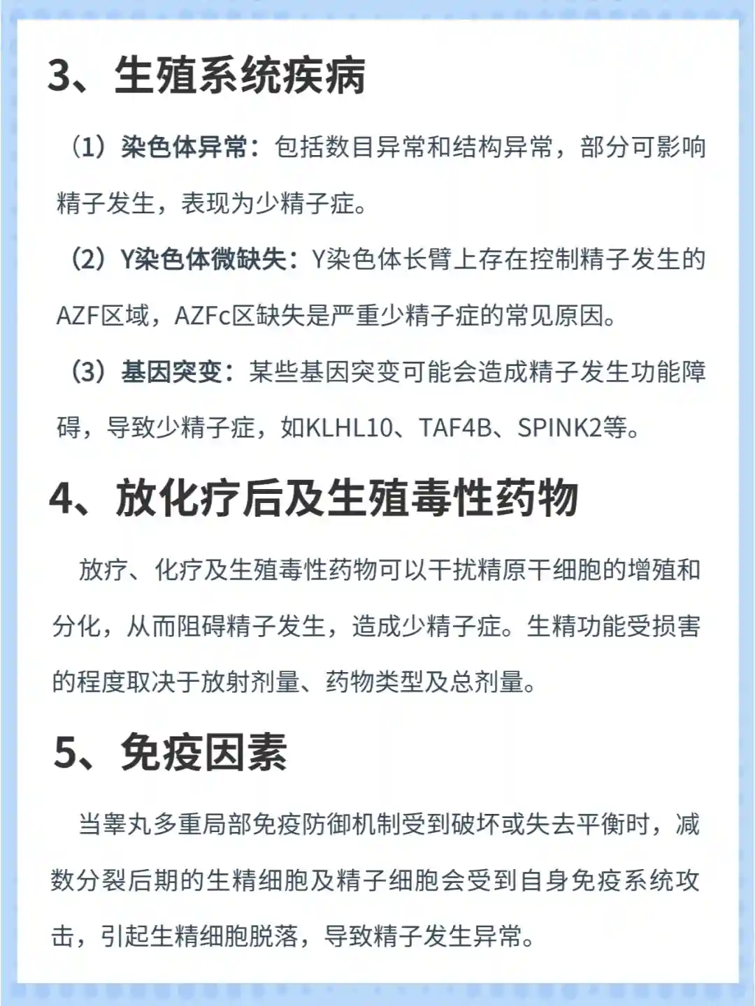 (1)染色体异常:包括数目异常和结构异常,部分可影响精子发生,表现为少精子症。