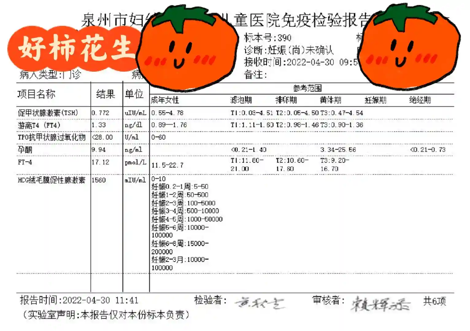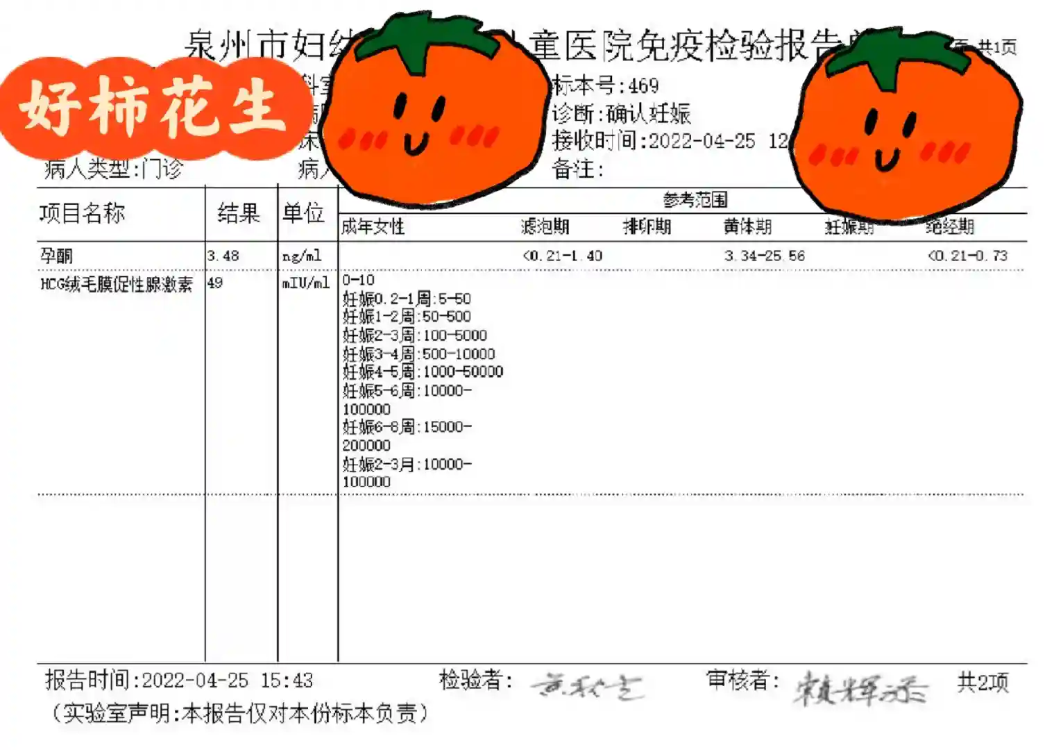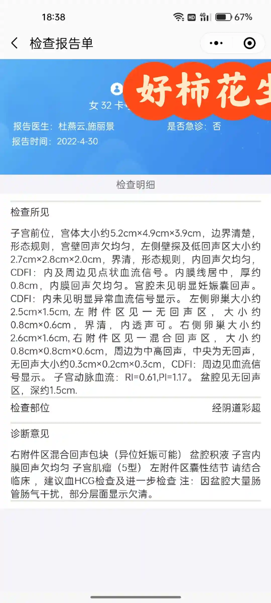没想到2022年四月底,我测出了意念灰!!天呐!!第二天就去医院验血(图二),过了两天,下面出血了(又期待又害怕)!又去抽血hcg翻倍很好(图三)!!本以为能开开心心的过五一。没想到测b超竟然是宫外孕。。。(图三图四)hcg翻倍得非常的好。。