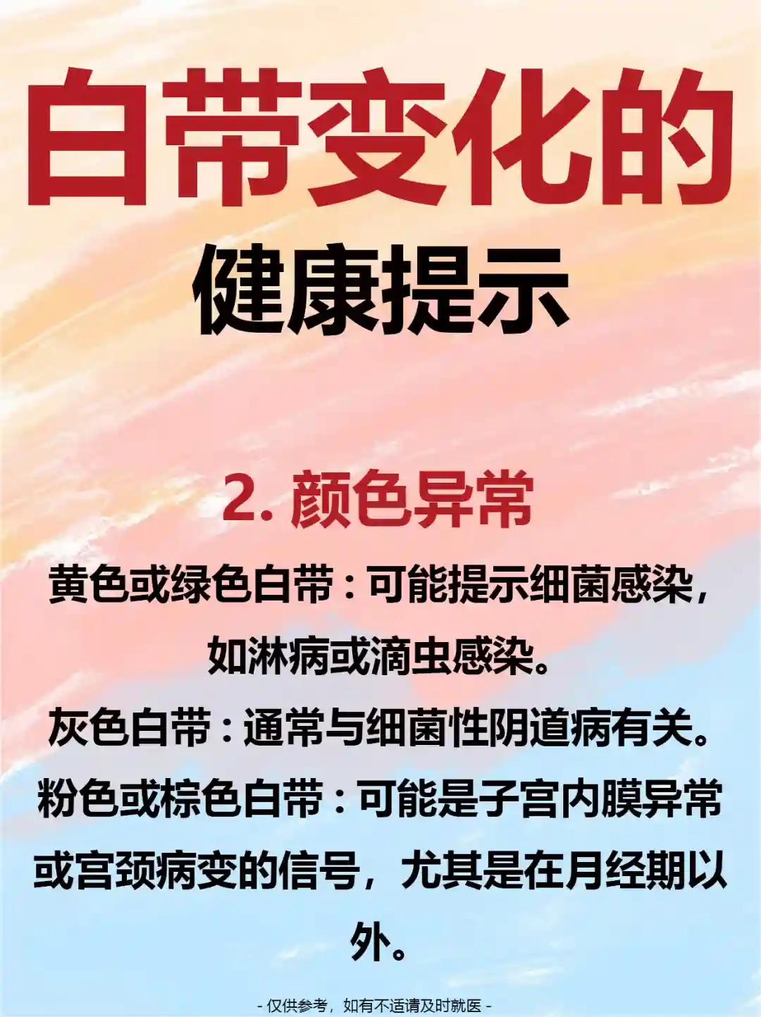 粉色或棕色白带:可能是子宫内膜异常或宫颈病变的信号,尤其是在月经期以外。