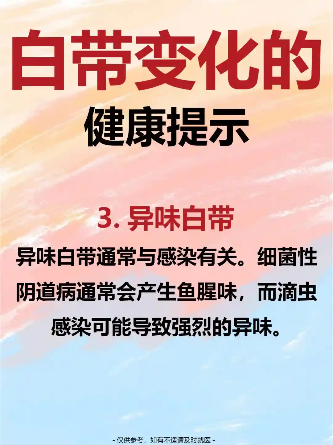 异味白带通常与感染有关。细菌性阴道病通常会产生鱼腥味,而滴虫感染可能导致强烈的异味。