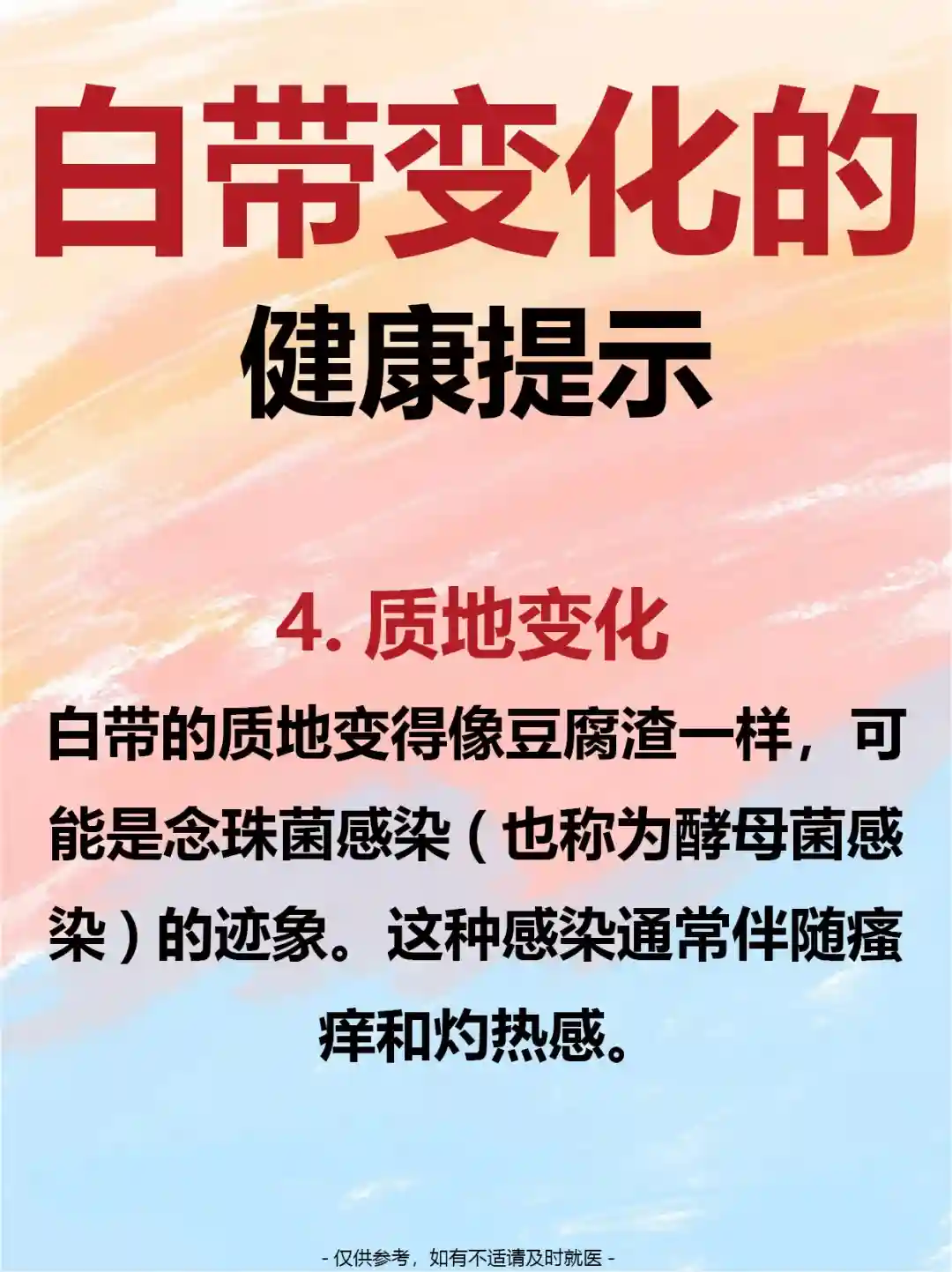 白带的质地变得像豆腐渣一样,可能是念珠菌感染(也称为酵母菌感染)的迹象。这种感染通常伴随瘙痒和灼热感。