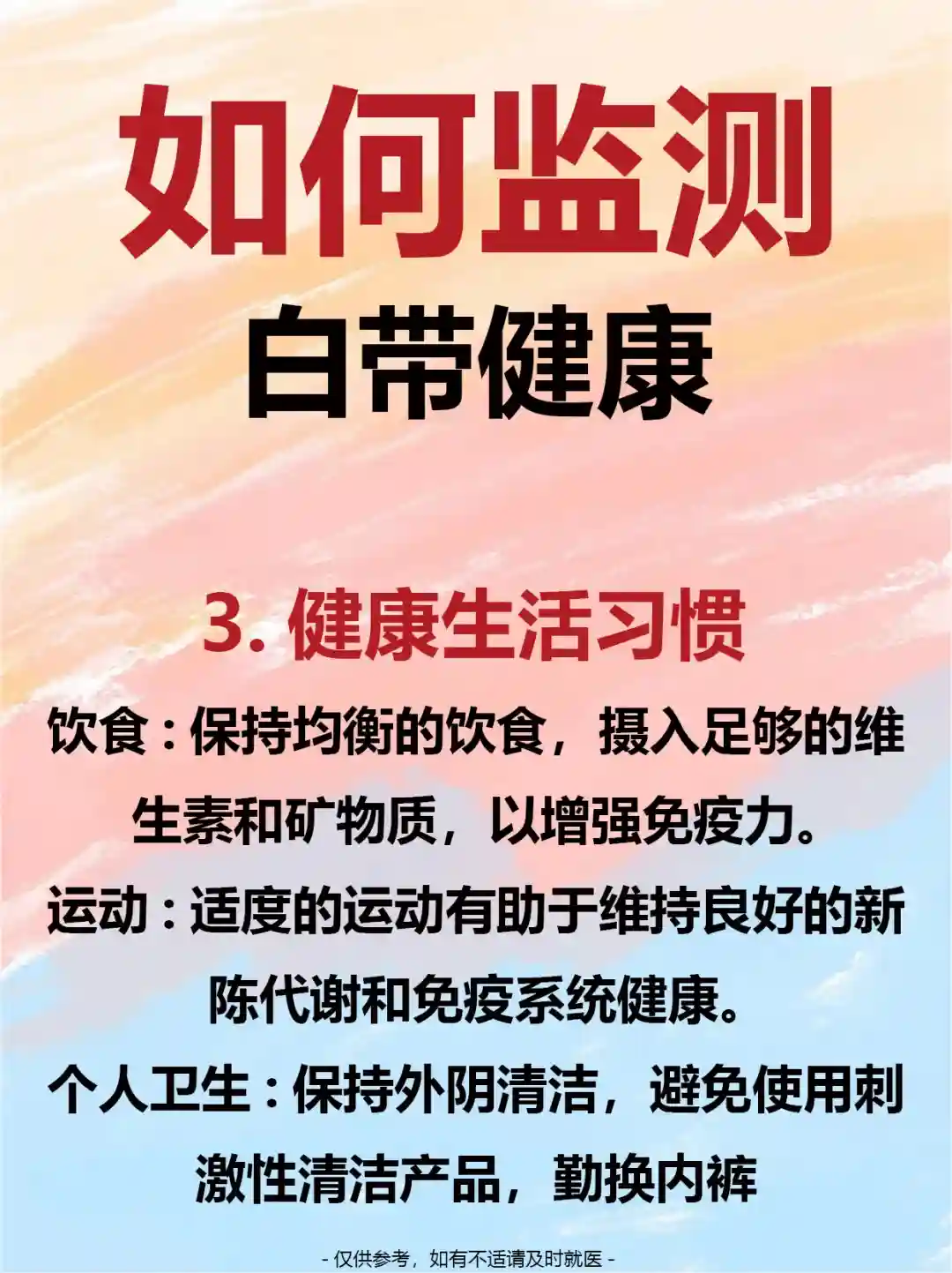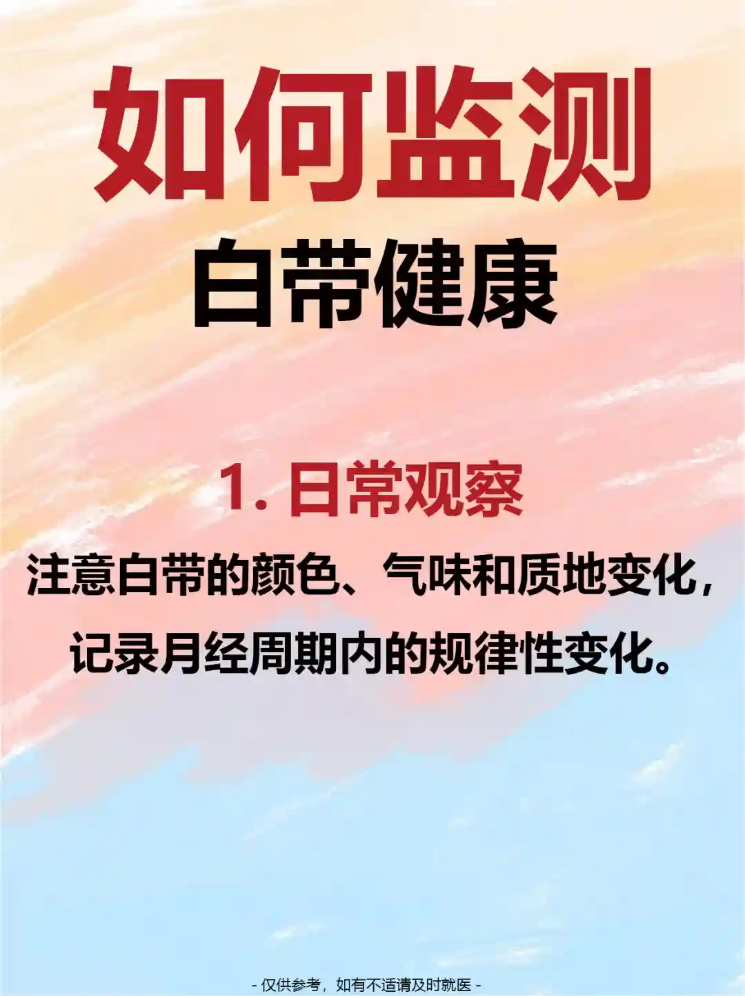 注意白带的颜色、气味和质地变化,记录月经周期内的规律性变化。